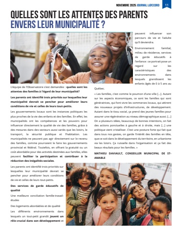 Novembre 2025Journal L@ccord 11quelles sont les attentes des parents envers leur municipalit%u00e9 ?L%u2019%u00e9quipe de l%u2019Observatoire s%u2019est demand%u00e9e : quelles sont les attentes des familles %u00e0 l'%u00e9gard de leur municipalit%u00e9?Les parents ont identifi%u00e9 trois priorit%u00e9s sur lesquelles leur municipalit%u00e9 devrait se pencher pour am%u00e9liorer leurs conditions de vie et celles de leurs tout-petits.Les gouvernements locaux sont les instances politiques les plus proches de la vie des enfants et des familles. En effet, les municipalit%u00e9s ont les comp%u00e9tences et les pouvoirs pour influencer directement la qualit%u00e9 de vie des familles, gr%u00e2ce %u00e0 des mesures dans des secteurs aussi vari%u00e9s que les loisirs, le transport, la s%u00e9curit%u00e9 publique et l%u2019habitation. Les municipalit%u00e9s ne peuvent pas agir directement sur le revenu des familles, comme pourraient le faire les gouvernements provincial et f%u00e9d%u00e9ral. Toutefois, en offrant la gratuit%u00e9 ou un co%u00fbt abordable pour des activit%u00e9s destin%u00e9es aux familles, elles peuvent faciliter la participation et contribuer %u00e0 la r%u00e9duction des in%u00e9galit%u00e9s sociales.Les parents ont identifi%u00e9 trois priorit%u00e9s sur lesquelles leur municipalit%u00e9 devrait se pencher pour am%u00e9liorer leurs conditions de vie et celles de leurs tout-petits.Des services de garde %u00e9ducatifs de qualit%u00e9Une meilleure conciliation famille-travail%u00e9tudesDes logements abordables et de qualit%u00e9Les diff%u00e9rents environnements dans lesquels un tout-petit grandit jouent un r%u00f4le crucial dans son d%u00e9veloppement et peuvent influencer son parcours de vie et l%u2019adulte qu%u2019il deviendra.Environnement familial, milieu de r%u00e9sidence, services de garde %u00e9ducatifs %u00e0 l%u2019enfance : ce portrait pose un regard sur les caract%u00e9ristiques des environnements dans lesquels grandissent les enfants %u00e2g%u00e9s de 0 %u00e0 5 ans au Qu%u00e9bec.%u00ab Les familles, c%u2019est comme le poumon d%u2019une ville [...]. Autant sur les aspects %u00e9conomiques, ce sont les familles qui sont g%u00e9n%u00e9ratrices, qui font vivre les commerces locaux, qui attirent des nouveaux projets d%u2019infrastructures, de d%u00e9veloppement. Autant dans le tissu social, %u00e7a prend des jeunes familles pour assurer une r%u00e9g%u00e9n%u00e9ration au niveau d%u00e9mographique aussi. [...]On a plusieurs id%u00e9es, beaucoup de bonnes intentions, on fait des actions ponctuelles %u00e0 gauche et %u00e0 droite, mais [...] une politique vient cristalliser. C%u2019est une posture forte qui fait que dans tous nos gestes, on garde l%u2019int%u00e9r%u00eat des familles en t%u00eate, que ce soit dans le d%u00e9veloppement du territoire, en urbanisme via les loisirs. %u00c7a ruisselle dans l%u2019organisation et %u00e7a fait des beaux r%u00e9sultats pour les familles. %u00bbMATHIEU DAVIAULT, CONSEILLER MUNICIPAL DE STAMABLE