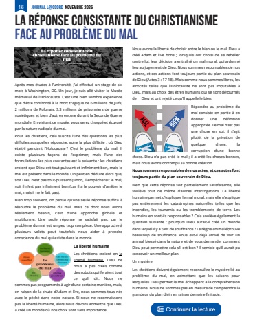 16 Journal L@ccord Novembre 2025Apr%u00e8s mes %u00e9tudes %u00e0 l%u2019universit%u00e9, j%u2019ai effectu%u00e9 un stage de six mois %u00e0 Washington, DC. Un jour, je suis all%u00e9 visiter le Mus%u00e9e m%u00e9morial de l%u2019Holocauste. C%u2019est une bien sombre exp%u00e9rience que d%u2019%u00eatre confront%u00e9 %u00e0 la mort tragique de 6 millions de Juifs, 2 millions de Polonais, 3,3 millions de prisonniers de guerre sovi%u00e9tiques et bien d%u2019autres encore durant la Seconde Guerre mondiale. En visitant ce mus%u00e9e, vous serez choqu%u00e9 et %u00e9c%u0153ur%u00e9 par la nature radicale du mal.Pour les chr%u00e9tiens, cela suscite l%u2019une des questions les plus difficiles auxquelles r%u00e9pondre, voire la plus difficile : o%u00f9 Dieu %u00e9tait-il pendant l%u2019Holocauste%u2009? C%u2019est le probl%u00e8me du mal. Il existe plusieurs fa%u00e7ons de l%u2019exprimer, mais l%u2019une des formulations les plus courantes est la suivante : les chr%u00e9tiens croient que Dieu est tout-puissant et infiniment bon, mais le mal est pr%u00e9sent dans le monde. On peut en d%u00e9duire alors que, soit Dieu n%u2019est pas tout-puissant (sinon, il emp%u00eacherait le mal) soit il n%u2019est pas infiniment bon (car il a le pouvoir d%u2019arr%u00eater le mal, mais il ne le fait pas).Bien trop souvent, on pense qu%u2019une seule r%u00e9ponse suffira %u00e0 r%u00e9soudre le probl%u00e8me du mal. Mais ce dont nous avons r%u00e9ellement besoin, c%u2019est d%u2019une approche globale et multiforme. Une seule r%u00e9ponse ne satisfait pas, car le probl%u00e8me du mal est un peu trop complexe. Une approche %u00e0 plusieurs volets peut toutefois nous aider %u00e0 prendre conscience du mal qui existe dans le monde.La libert%u00e9 humaineLes chr%u00e9tiens croient en la libert%u00e9 humaine. Dieu ne nous a pas cr%u00e9%u00e9s comme des robots qui feraient tout ce qu%u2019Il dit. Nous ne sommes pas programm%u00e9s %u00e0 agir d%u2019une certaine mani%u00e8re, mais, en raison de la chute d%u2019Adam et %u00c8ve, nous sommes tous n%u00e9s avec le p%u00e9ch%u00e9 dans notre nature. Si nous ne reconnaissons pas la libert%u00e9 humaine, alors nous devons admettre que Dieu a cr%u00e9%u00e9 un monde o%u00f9 nos choix sont sans importance.Nous avons la libert%u00e9 de choisir entre le bien ou le mal. Dieu a cr%u00e9%u00e9 Adam et %u00c8ve bons ; lorsqu%u2019ils ont choisi de se rebeller contre lui, leur d%u00e9cision a entra%u00een%u00e9 un mal moral, qui a donn%u00e9 lieu au jugement de Dieu. Nous sommes responsables de nos actions, et ces actions font toujours partie du plan souverain de Dieu (Actes 3 : 17-18). Mais comme nous sommes libres, les atrocit%u00e9s telles que l%u2019Holocauste ne sont pas imputables %u00e0 Dieu, mais au choix des %u00eatres humains qui se sont d%u00e9tourn%u00e9s de Dieu et ont rejet%u00e9 ce qu%u2019Il appelle le bien.R%u00e9pondre au probl%u00e8me du mal consiste en partie %u00e0 en donner une d%u00e9finition appropri%u00e9e. Le mal n%u2019est pas une chose en soi, il s%u2019agit plut%u00f4t de la privation de quelque chose, la corruption d%u2019une bonne chose. Dieu n%u2019a pas cr%u00e9%u00e9 le mal ; il a cr%u00e9%u00e9 les choses bonnes, mais nous avons corrompu sa bonne cr%u00e9ation.Nous sommes responsables de nos actes, et ces actes font toujours partie du plan souverain de Dieu.%u2009Bien que cette r%u00e9ponse soit partiellement satisfaisante, elle soul%u00e8ve tout de m%u00eame d%u2019autres interrogations. La libert%u00e9 humaine permet d%u2019expliquer le mal moral, mais elle n%u2019explique pas enti%u00e8rement les catastrophes naturelles telles que les incendies, les tsunamis ou les tremblements de terre. Les humains en sont-ils responsables%u2009? Cela soul%u00e8ve %u00e9galement la question suivante : pourquoi Dieu aurait-il cr%u00e9%u00e9 un monde dans lequel il y a tant de souffrance%u2009? Le r%u00e8gne animal %u00e9prouve beaucoup de souffrance. Vous est-il d%u00e9j%u00e0 arriv%u00e9 de voir un animal bless%u00e9 dans la nature et de vous demander comment Dieu peut permettre cela s%u2019Il est bon%u2009? Il semble qu%u2019Il aurait pu concevoir un meilleur plan.Un myst%u00e8reLes chr%u00e9tiens doivent %u00e9galement reconna%u00eetre le myst%u00e8re li%u00e9 au probl%u00e8me du mal, en admettant que les raisons pour lesquelles Dieu permet le mal %u00e9chappent %u00e0 la compr%u00e9hension humaine. Nous ne sommes pas en mesure de comprendre la grandeur du plan divin en raison de notre finitude. la r%u00e9ponse consistante du christianisme face au probl%u00e8me du mal