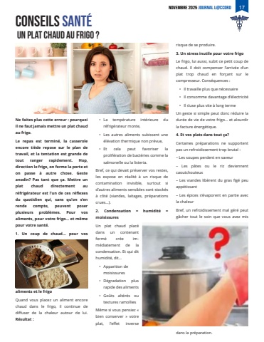 Novembre 2025Journal L@ccord 17Ne faites plus cette erreur : pourquoi il ne faut jamais mettre un plat chaud au frigo.Le repas est termin%u00e9, la casserole encore ti%u00e8de repose sur le plan de travail, et la tentation est grande de tout ranger rapidement. Hop, direction le frigo, on ferme la porte et on passe %u00e0 autre chose. Geste anodin? Pas tant que %u00e7a. Mettre un plat chaud directement au r%u00e9frig%u00e9rateur est l%u2019un de ces r%u00e9flexes du quotidien qui, sans qu%u2019on s%u2019en rende compte, peuvent poser plusieurs probl%u00e8mes. Pour vos aliments, pour votre frigo... et m%u00eame pour votre sant%u00e9.1. Un coup de chaud%u2026 pour vos aliments et le frigoQuand vous placez un aliment encore chaud dans le frigo, il continue de diffuser de la chaleur autour de lui. R%u00e9sultat :%u2022 La temp%u00e9rature int%u00e9rieure du r%u00e9frig%u00e9rateur monte,%u2022 Les autres aliments subissent une %u00e9l%u00e9vation thermique non pr%u00e9vue,%u2022 Et cela peut favoriser la prolif%u00e9ration de bact%u00e9ries comme la salmonelle ou la listeria.Bref, ce qui devait pr%u00e9server vos restes, les expose en r%u00e9alit%u00e9 %u00e0 un risque de contamination invisible, surtout si d%u2019autres aliments sensibles sont stock%u00e9s %u00e0 c%u00f4t%u00e9 (viandes, laitages, pr%u00e9parations crues%u2026).2. Condensation = humidit%u00e9 = moisissuresUn plat chaud plac%u00e9 dans un contenant ferm%u00e9 cr%u00e9e imm%u00e9diatement de la condensation. Et qui dit humidit%u00e9, dit%u2026%u2022 Apparition de moisissures%u2022 D%u00e9gradation plus rapide des aliments%u2022 Go%u00fbts alt%u00e9r%u00e9s ou textures ramolliesM%u00eame si vous pensiez %u00ab bien conserver %u00bb votre plat, l%u2019effet inverse risque de se produire.3. Un stress inutile pour votre frigoLe frigo, lui aussi, subit ce petit coup de chaud. Il doit compenser l%u2019arriv%u00e9e d%u2019un plat trop chaud en for%u00e7ant sur le compresseur. Cons%u00e9quences :%u2022 Il travaille plus que n%u00e9cessaire%u2022 Il consomme davantage d%u2019%u00e9lectricit%u00e9%u2022 Il s%u2019use plus vite %u00e0 long termeUn geste si simple peut donc r%u00e9duire la dur%u00e9e de vie de votre frigo%u2026 et alourdir la facture %u00e9nerg%u00e9tique.4. Et vos plats dans tout %u00e7a?Certaines pr%u00e9parations ne supportent pas un refroidissement trop brutal :%u2013 Les soupes perdent en saveur%u2013 Les p%u00e2tes ou le riz deviennent caoutchouteux%u2013 Les viandes lib%u00e8rent du gras fig%u00e9 peu app%u00e9tissant%u2013 Les %u00e9pices s%u2019%u00e9vaporent en partie avec la chaleurBref, un refroidissement mal g%u00e9r%u00e9 peut g%u00e2cher tout le soin que vous avez mis dans la pr%u00e9paration.conseils sant%u00e9 un plat chaud au frigo ?