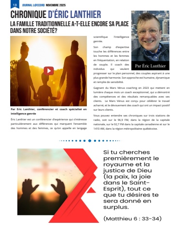 18 Journal L@ccord Novembre 2025Chronique d%u2019%u00e9ric lanthierLa famille traditionnelle a-t-elle encore sa place Dans notre soci%u00e9t%u00e9?Par Eric Lanthier, conf%u00e9rencier et coach sp%u00e9cialis%u00e9 en intelligence genr%u00e9e%u00c9ric Lanthier est un conf%u00e9rencier d%u2019exp%u00e9rience qui s%u2019int%u00e9resse particuli%u00e8rement aux diff%u00e9rences qui marquent l%u2019ensemble des hommes et des femmes, ce qu%u2019on appelle en langage scientifique l%u2019intelligence genr%u00e9e.Son champ d%u2019expertise touche les diff%u00e9rences entre les hommes et les femmes en fr%u00e9quentation, en relation de couple. Il coach des individus qui veulent progresser sur le plan personnel, des couples aspirant %u00e0 une plus grande harmonie. Son approche est humaine, dynamique et remplie de sensibilit%u00e9. Gagnant du Mars V%u00e9nus coaching en 2023 qui mettent en lumi%u00e8re chaque mois un coach exceptionnel, qui a d%u00e9montr%u00e9 des comp%u00e9tences et des r%u00e9sultats remarquables avec ses clients. Le Mars V%u00e9nus est con%u00e7u pour c%u00e9l%u00e9brer le travail acharn%u00e9, et le d%u00e9vouement des coach qui ont un impact positif sur leurs clients. Vous pouvez entendre ses chroniques sur trois stations de radio, soit sur le 96,9 FM, dans la r%u00e9gion de la capitale nationale, sur le 92,7 FM dans la capitale canadienne et sur le 1410 AM, dans la r%u00e9gion m%u00e9tropolitaine qu%u00e9b%u00e9coise.