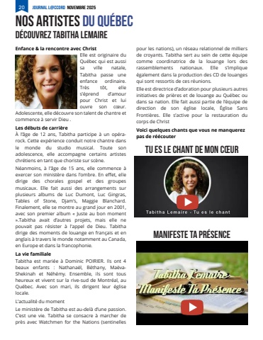 20 Journal L@ccord Novembre 2025Nos artistes du qu%u00e9becD%u00e9couvrez Tabitha Lemaire Manifeste ta pr%u00e9sence Tu es le chant de mon c%u0153urEnfance & la rencontre avec ChristElle est originaire du Qu%u00e9bec qui est aussi sa ville natale, Tabitha passe une enfance ordinaire. Tr%u00e8s t%u00f4t, elle s%u2019%u00e9prend d%u2019amour pour Christ et lui ouvre son c%u0153ur. Adolescente, elle d%u00e9couvre son talent de chantre et commence %u00e0 servir Dieu .Les d%u00e9buts de carri%u00e8re%u00c0 l%u2019%u00e2ge de 12 ans, Tabitha participe %u00e0 un op%u00e9rarock. Cette exp%u00e9rience conduit notre chantre dans le monde du studio musical. Toute son adolescence, elle accompagne certains artistes chr%u00e9tiens en tant que choriste sur sc%u00e8ne.N%u00e9anmoins, %u00e0 l%u2019%u00e2ge de 15 ans, elle commence %u00e0 exercer son minist%u00e8re dans l%u2019ombre. En effet, elle dirige des chorales gospel et des groupes musicaux. Elle fait aussi des arrangements sur plusieurs albums de Luc Dumont, Luc Gingras, Tables of Stone, Djam%u2019s, Maggie Blanchard. Finalement, elle se montre au grand jour en 2001, avec son premier album %u00ab Juste au bon moment %u00bb.Tabitha avait d%u2019autres projets, mais elle ne pouvait pas r%u00e9sister %u00e0 l%u2019appel de Dieu. Tabitha dirige des moments de louange en fran%u00e7ais et en anglais %u00e0 travers le monde notamment au Canada, en Europe et dans la francophonie.La vie familialeTabitha est mari%u00e9e %u00e0 Dominic POIRIER. Ils ont 4 beaux enfants : Nathana%u00ebl, B%u00e9thany, Ma%u00ebvaShekinah et N%u00e9h%u00e9my. Ensemble, ils sont tous heureux et vivent sur la rive-sud de Montr%u00e9al, au Qu%u00e9bec. Avec son mari, ils dirigent leur %u00e9glise locale.L%u2019actualit%u00e9 du momentLe minist%u00e8re de Tabitha est au-del%u00e0 d%u2019une passion. C%u2019est une vie. Tabitha se consacre %u00e0 marcher de pr%u00e8s avec Watchmen for the Nations (sentinelles pour les nations), un r%u00e9seau relationnel de milliers de croyants. Tabitha sert au sein de cette %u00e9quipe comme coordinatrice de la louange lors des rassemblements nationaux. Elle s%u2019implique %u00e9galement dans la production des CD de louanges qui sont ressortis de ces r%u00e9unions.Elle est directrice d%u2019adoration pour plusieurs autres initiatives de pri%u00e8res et de louange au Qu%u00e9bec ou dans sa nation. Elle fait aussi partie de l%u2019%u00e9quipe de direction de son %u00e9glise locale, %u00c9glise Sans Fronti%u00e8res. Elle s%u2019active pour la restauration du corps de ChristVoici quelques chants que vous ne manquerez pas de r%u00e9%u00e9couter