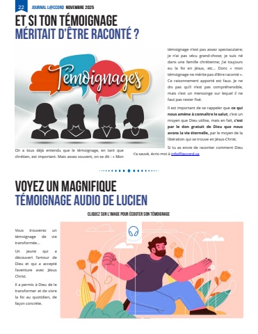 22 Journal L@ccord Novembre 2025ET SI TON T%u00c9MOIGNAGE M%u00c9RITAIT D%u2019%u00caTRE RACONT%u00c9 ?voyez un magnifique t%u00e9moignage audio de lucienOn a tous d%u00e9j%u00e0 entendu que le t%u00e9moignage, en tant que chr%u00e9tien, est important. Mais assez souvent, on se dit : %u00ab Mon t%u00e9moignage n%u2019est pas assez spectaculaire; je n%u2019ai pas v%u00e9cu grand-chose; je suis n%u00e9 dans une famille chr%u00e9tienne; j%u2019ai toujours eu la foi en J%u00e9sus, etc%u2026 Donc %u00ab mon t%u00e9moignage ne m%u00e9rite pas d%u2019%u00eatre racont%u00e9 %u00bb. Ce raisonnement apport%u00e9 est faux. Je ne dis pas qu%u2019il n%u2019est pas compr%u00e9hensible, mais c%u2019est un mensonge sur lequel il ne faut pas rester fix%u00e9.Il est important de se rappeler que ce qui nous am%u00e8ne %u00e0 conna%u00eetre le salut, c%u2019est un moyen que Dieu utilise, mais en fait, c%u2019est par le don gratuit de Dieu que nous avons la vie %u00e9ternelle, par le moyen de la lib%u00e9ration qui se trouve en J%u00e9sus-Christ.Si tu as envie de raconter comment Dieu t%u2019a sauv%u00e9, %u00e9cris-moi %u00e0 info@laccord.caVous trouverez un t%u00e9moignage de vie transform%u00e9e%u2026Un jeune qui a d%u00e9couvert l%u2019amour de Dieu et qui a accept%u00e9 l%u2019aventure avec J%u00e9sus Christ.Il a permis %u00e0 Dieu de le transformer et de vivre la foi au quotidien, de fa%u00e7on concr%u00e8te.Cliquez sur l%u2019image pour %u00e9couter son t%u00e9moignage