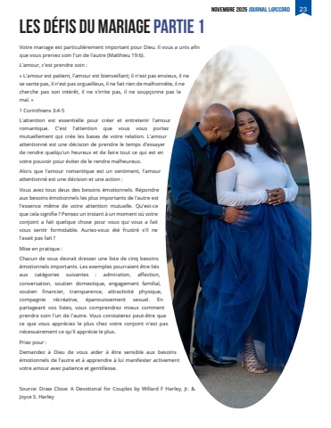 Novembre 2025Journal L@ccord 23LES D%u00c9FIS DU MARIAGE PARTIE 1Votre mariage est particuli%u00e8rement important pour Dieu. Il vous a unis afin que vous preniez soin l'un de l'autre (Matthieu 19:6). L'amour, c'est prendre soin :%u00ab L'amour est patient, l'amour est bienveillant; il n'est pas envieux, il ne se vante pas, il n'est pas orgueilleux, il ne fait rien de malhonn%u00eate, il ne cherche pas son int%u00e9r%u00eat, il ne s'irrite pas, il ne soup%u00e7onne pas le mal. %u00bb1 Corinthiens 3:4-5L'attention est essentielle pour cr%u00e9er et entretenir l'amour romantique. C'est l'attention que vous vous portez mutuellement qui cr%u00e9e les bases de votre relation. L'amour attentionn%u00e9 est une d%u00e9cision de prendre le temps d'essayer de rendre quelqu'un heureux et de faire tout ce qui est en votre pouvoir pour %u00e9viter de le rendre malheureux. Alors que l'amour romantique est un sentiment, l'amour attentionn%u00e9 est une d%u00e9cision et une action :Vous avez tous deux des besoins %u00e9motionnels. R%u00e9pondre aux besoins %u00e9motionnels les plus importants de l'autre est l'essence m%u00eame de votre attention mutuelle. Qu'est-ce que cela signifie ? Pensez un instant %u00e0 un moment o%u00f9 votre conjoint a fait quelque chose pour vous qui vous a fait vous sentir formidable. Auriez-vous %u00e9t%u00e9 frustr%u00e9 s'il ne l'avait pas fait ?Mise en pratique : Chacun de vous devrait dresser une liste de cinq besoins %u00e9motionnels importants. Les exemples pourraient %u00eatre li%u00e9s aux cat%u00e9gories suivantes : admiration, affection, conversation, soutien domestique, engagement familial, soutien financier, transparence, attractivit%u00e9 physique, compagnie r%u00e9cr%u00e9ative, %u00e9panouissement sexuel. En partageant vos listes, vous comprendrez mieux comment prendre soin l'un de l'autre. Vous constaterez peut-%u00eatre que ce que vous appr%u00e9ciez le plus chez votre conjoint n'est pas n%u00e9cessairement ce qu'il appr%u00e9cie le plus.Priez pour :Demandez %u00e0 Dieu de vous aider %u00e0 %u00eatre sensible aux besoins %u00e9motionnels de l'autre et %u00e0 apprendre %u00e0 lui manifester activement votre amour avec patience et gentillesse.Source: Draw Close: A Devotional for Couples by Willard F Harley, Jr. & Joyce S. Harley