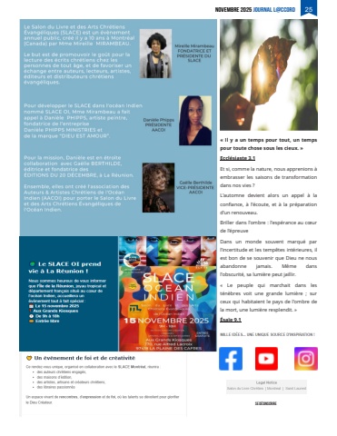 Se d%u00e9sinscrire%u00ab Il y a un temps pour tout, un temps pour toute chose sous les cieux. %u00bbEccl%u00e9siaste 3.1Et si, comme la nature, nous apprenions %u00e0 embrasser les saisons de transformation dans nos vies ?L%u2019automne devient alors un appel %u00e0 la confiance, %u00e0 l%u2019%u00e9coute, et %u00e0 la pr%u00e9paration d%u2019un renouveau.Briller dans l%u2019ombre : l%u2019esp%u00e9rance au c%u0153ur de l%u2019%u00e9preuveDans un monde souvent marqu%u00e9 par l%u2019incertitude et les temp%u00eates int%u00e9rieures, il est bon de se souvenir que Dieu ne nous abandonne jamais. M%u00eame dans l%u2019obscurit%u00e9, sa lumi%u00e8re peut jaillir.%u00ab Le peuple qui marchait dans les t%u00e9n%u00e8bres voit une grande lumi%u00e8re ; sur ceux qui habitaient le pays de l%u2019ombre de la mort, une lumi%u00e8re resplendit. %u00bb%u00c9sa%u00efe 9.1Novembre 2025Journal L@ccord 25