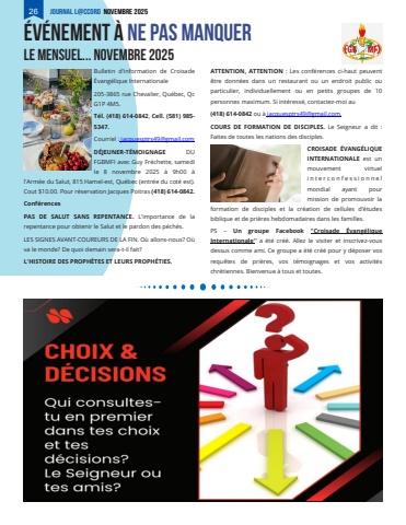 LE MENSUEL... Novembre 2025Bulletin d'information de Croisade %u00c9vang%u00e9lique Internationale205-3865 rue Chevalier, Qu%u00e9bec, Qc G1P 4M5. T%u00e9l. (418) 614-0842, Cell. (581) 985-5347. Courriel : jacquesptrs49@gmail.comD%u00c9JEUNER-T%u00c9MOIGNAGE DU FGBMFI avec Guy Fr%u00e9chette, samedi le 8 novembre 2025 %u00e0 9h00 %u00e0 l'Arm%u00e9e du Salut, 815 Hamel-est, Qu%u00e9bec (entr%u00e9e du cot%u00e9 est). Cout $10.00. Pour r%u00e9servation Jacques Poitras (418) 614-0842.Conf%u00e9rencesPAS DE SALUT SANS REPENTANCE. L'importance de la repentance pour obtenir le Salut et le pardon des p%u00e9ch%u00e9s. LES SIGNES AVANT-COUREURS DE LA FIN. O%u00f9 allons-nous? O%u00f9 va le monde? De quoi demain sera-t-il fait? L'HISTOIRE DES PROPH%u00c8TES ET LEURS PROPH%u00c9TIES. ATTENTION, ATTENTION : Les conf%u00e9rences ci-haut peuvent %u00eatre donn%u00e9es dans un restaurant ou un endroit public ou particulier, individuellement ou en petits groupes de 10 personnes maximum. Si int%u00e9ress%u00e9, contactez-moi au (418) 614-0842 ou %u00e0 jacquesptrs49@gmail.com.COURS DE FORMATION DE DISCIPLES. Le Seigneur a dit : Faites de toutes les nations des disciples.CROISADE %u00c9VANG%u00c9LIQUE INTERNATIONALE est un mouvement virtuel i n t e r c o n f e s s i o n n e l mondial ayant pour mission de promouvoir la formation de disciples et la cr%u00e9ation de cellules d'%u00e9tudes biblique et de pri%u00e8res hebdomadaires dans les familles.PS %u2013 Un groupe Facebook ''Croisade %u00c9vang%u00e9lique Internationale'' a %u00e9t%u00e9 cr%u00e9%u00e9. Allez le visiter et inscrivez-vous dessus comme ami. Ce groupe a %u00e9t%u00e9 cr%u00e9%u00e9 pour y d%u00e9poser vos requ%u00eates de pri%u00e8res, vos t%u00e9moignages et vos activit%u00e9s chr%u00e9tiennes. Bienvenue %u00e0 tous et toutes.%u00c9v%u00e9nement %u00e0 ne pas manquer26 Journal L@ccord Novembre 2025