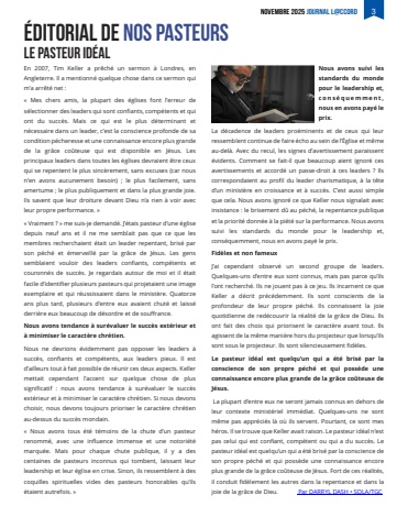 Novembre 2025Journal L@ccord 3Le pasteur id%u00e9alEn 2007, Tim Keller a pr%u00each%u00e9 un sermon %u00e0 Londres, en Angleterre. Il a mentionn%u00e9 quelque chose dans ce sermon qui m%u2019a arr%u00eat%u00e9 net :%u00ab Mes chers amis, la plupart des %u00e9glises font l%u2019erreur de s%u00e9lectionner des leaders qui sont confiants, comp%u00e9tents et qui ont du succ%u00e8s. Mais ce qui est le plus d%u00e9terminant et n%u00e9cessaire dans un leader, c%u2019est la conscience profonde de sa condition p%u00e9cheresse et une connaissance encore plus grande de la gr%u00e2ce co%u00fbteuse qui est disponible en J%u00e9sus. Les principaux leaders dans toutes les %u00e9glises devraient %u00eatre ceux qui se repentent le plus sinc%u00e8rement, sans excuses (car nous n%u2019en avons aucunement besoin) ; le plus facilement, sans amertume ; le plus publiquement et dans la plus grande joie. Ils savent que leur droiture devant Dieu n%u2019a rien %u00e0 voir avec leur propre performance. %u00bb%u00ab Vraiment ? %u00bb me suis-je demand%u00e9. J%u2019%u00e9tais pasteur d%u2019une %u00e9glise depuis neuf ans et il ne me semblait pas que ce que les membres recherchaient %u00e9tait un leader repentant, bris%u00e9 par son p%u00e9ch%u00e9 et %u00e9merveill%u00e9 par la gr%u00e2ce de J%u00e9sus. Les gens semblaient vouloir des leaders confiants, comp%u00e9tents et couronn%u00e9s de succ%u00e8s. Je regardais autour de moi et il %u00e9tait facile d%u2019identifier plusieurs pasteurs qui projetaient une image exemplaire et qui r%u00e9ussissaient dans le minist%u00e8re. Quatorze ans plus tard, plusieurs d%u2019entre eux avaient chut%u00e9 et laiss%u00e9 derri%u00e8re eux beaucoup de d%u00e9sordre et de souffrance.Nous avons tendance %u00e0 sur%u00e9valuer le succ%u00e8s ext%u00e9rieur et %u00e0 minimiser le caract%u00e8re chr%u00e9tien.Nous ne devrions %u00e9videmment pas opposer les leaders %u00e0 succ%u00e8s, confiants et comp%u00e9tents, aux leaders pieux. Il est d%u2019ailleurs tout %u00e0 fait possible de r%u00e9unir ces deux aspects. Keller mettait cependant l%u2019accent sur quelque chose de plus significatif : nous avons tendance %u00e0 sur%u00e9valuer le succ%u00e8s ext%u00e9rieur et %u00e0 minimiser le caract%u00e8re chr%u00e9tien. Si nous devons choisir, nous devons toujours prioriser le caract%u00e8re chr%u00e9tien au-dessus du succ%u00e8s mondain.%u00ab Nous avons tous %u00e9t%u00e9 t%u00e9moins de la chute d%u2019un pasteur renomm%u00e9, avec une influence immense et une notori%u00e9t%u00e9 marqu%u00e9e. Mais pour chaque chute publique, il y a des centaines de pasteurs inconnus qui tombent, laissant leur leadership et leur %u00e9glise en crise. Sinon, ils ressemblent %u00e0 des coquilles spirituelles vides des pasteurs honorables qu%u2019ils %u00e9taient autrefois. %u00bb%u00c9ditorial de nos pasteursNous avons suivi les standards du monde pour le leadership et, c o n s %u00e9 q u e m m e n t , nous en avons pay%u00e9 le prix.La d%u00e9cadence de leaders pro%u00e9minents et de ceux qui leur ressemblent continue de faire %u00e9cho au sein de l%u2019%u00c9glise et m%u00eame au-del%u00e0. Avec du recul, les signes d%u2019avertissement paraissent %u00e9vidents. Comment se fait-il que beaucoup aient ignor%u00e9 ces avertissements et accord%u00e9 un passe-droit %u00e0 ces leaders ? Ils correspondaient au profil du leader charismatique, %u00e0 la t%u00eate d%u2019un minist%u00e8re en croissance et %u00e0 succ%u00e8s. C%u2019est aussi simple que cela. Nous avons ignor%u00e9 ce que Keller nous signalait avec insistance : le brisement d%u00fb au p%u00e9ch%u00e9, la repentance publique et la priorit%u00e9 donn%u00e9e %u00e0 la pi%u00e9t%u00e9 sur la performance. Nous avons suivi les standards du monde pour le leadership et, cons%u00e9quemment, nous en avons pay%u00e9 le prix.Fid%u00e8les et non fameuxJ%u2019ai cependant observ%u00e9 un second groupe de leaders. Quelques-uns d%u2019entre eux sont connus, mais pas parce qu%u2019ils l%u2019ont recherch%u00e9. Ils ne jouent pas %u00e0 ce jeu. Ils incarnent ce que Keller a d%u00e9crit pr%u00e9c%u00e9demment. Ils sont conscients de la profondeur de leur propre p%u00e9ch%u00e9. Ils connaissent la joie quotidienne de red%u00e9couvrir la r%u00e9alit%u00e9 de la gr%u00e2ce de Dieu. Ils ont fait des choix qui priorisent le caract%u00e8re avant tout. Ils agissent de la m%u00eame mani%u00e8re hors du projecteur que lorsqu%u2019ils sont sous le projecteur. Ils sont silencieusement fid%u00e8les.Le pasteur id%u00e9al est quelqu%u2019un qui a %u00e9t%u00e9 bris%u00e9 par la conscience de son propre p%u00e9ch%u00e9 et qui poss%u00e8de une connaissance encore plus grande de la gr%u00e2ce co%u00fbteuse de J%u00e9sus.La plupart d%u2019entre eux ne seront jamais connus en dehors de leur contexte minist%u00e9riel imm%u00e9diat. Quelques-uns ne sont m%u00eame pas appr%u00e9ci%u00e9s l%u00e0 o%u00f9 ils servent. Pourtant, ce sont mes h%u00e9ros. Il se trouve que Keller avait raison. Le pasteur id%u00e9al n%u2019est pas celui qui est confiant, comp%u00e9tent ou qui a du succ%u00e8s. Le pasteur id%u00e9al est quelqu%u2019un qui a %u00e9t%u00e9 bris%u00e9 par la conscience de son propre p%u00e9ch%u00e9 et qui poss%u00e8de une connaissance encore plus grande de la gr%u00e2ce co%u00fbteuse de J%u00e9sus. Fort de ces r%u00e9alit%u00e9s, il conduit fid%u00e8lement les autres dans la repentance et dans la joie de la gr%u00e2ce de Dieu. Par DARRYL DASH %u2022 SOLA/TGC