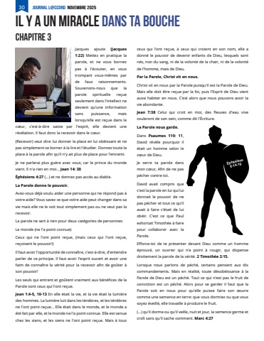 30 Journal L@ccord Novembre 2025Jacques ajoute (Jacques 1:22) Mettez en pratique la parole, et ne vous bornez pas %u00e0 l'%u00e9couter, en vous trompant vous-m%u00eames par de faux raisonnements. Souvenons-nous que la parole spirituelle re%u00e7ue seulement dans l'intellect ne devient qu'une information sans puissance, mais lorsqu'elle est re%u00e7ue dans le c%u0153ur, c'est-%u00e0-dire saisie par l'esprit, elle devient une r%u00e9v%u00e9lation. Il faut donc la recevoir dans le c%u0153ur.(Recevoir) veut dire: lui donner la place en lui ob%u00e9issant et ne pas simplement se borner %u00e0 la lire et l'%u00e9tudier. Donnez toute la place %u00e0 la parole afin qu'il n'y ait plus de place pour l'ennemi.Je ne parlerai plus gu%u00e8re avec vous; car le prince du monde vient. Il n'a rien en moi... Jean 14: 30%u00c9ph%u00e9siens 4:27 (...) et ne donnez pas acc%u00e8s au diable.La Parole donne le pouvoir.Avez-vous d%u00e9j%u00e0 voulu aider une personne qui ne r%u00e9pond pas %u00e0 votre aide? Vous savez ce que votre aide peut changer dans sa vie mais elle ne le voit tout simplement pas ou ne veut pas la recevoir.La parole ne sert %u00e0 rien pour deux cat%u00e9gories de personnes:Le monde (ne l'a point connue)Ceux qui ne l'ont point re%u00e7ue, (mais ceux qui l'ont re%u00e7ue, re%u00e7oivent le pouvoir!)Il faut avoir l'opportunit%u00e9 de conna%u00eetre, c'est-%u00e0-dire, d'entendre parler de ce principe. Il faut avoir l'esprit ouvert et avoir une faim de conna%u00eetre la v%u00e9rit%u00e9 pour la recevoir afin de go%u00fbter %u00e0 son pouvoir!Les seuls qui entrent et go%u00fbtent vraiment aux b%u00e9n%u00e9fices de la Parole sont ceux qui l'ont re%u00e7ue.Jean 1:4-5, 10-13 En elle %u00e9tait la vie, et la vie %u00e9tait la lumi%u00e8re des hommes. La lumi%u00e8re luit dans les t%u00e9n%u00e8bres, et les t%u00e9n%u00e8bres ne l'ont point re%u00e7ue... Elle %u00e9tait dans le monde, et le monde a %u00e9t%u00e9 fait par elle, et le monde ne l'a point connue. Elle est venue chez les siens, et les siens ne l'ont point re%u00e7ue. Mais %u00e0 tous ceux qui l'ont re%u00e7ue, %u00e0 ceux qui croient en son nom, elle a donn%u00e9 le pouvoir de devenir enfants de Dieu, lesquels sont n%u00e9s, non du sang, ni de la volont%u00e9 de la chair, ni de la volont%u00e9 de l'homme, mais de Dieu.Par la Parole, Christ vit en nous.Christ vit en nous par la Parole puisqu'il est la Parole de Dieu. Mais elle doit %u00eatre re%u00e7ue par la foi, puis l'Esprit de Dieu vient aussi habiter en nous. C'est alors que nous pouvons avoir la vie abondante.Jean 7:38 Celui qui croit en moi, des fleuves d'eau vive couleront de son sein, comme dit l'%u00c9criture.La Parole nous garde.Dans Psaumes 119: 11, David r%u00e9v%u00e8le pourquoi il %u00e9tait un homme selon le c%u0153ur de Dieu.Je serre ta parole dans mon c%u0153ur, Afin de ne pas p%u00e9cher contre toi.David avait compris que c'est la parole en lui qui lui donnait le pouvoir de ne pas p%u00e9cher et tout ce qu'il avait %u00e0 faire c'%u00e9tait de lui ob%u00e9ir. C'est ce que Paul exhortait Timoth%u00e9e %u00e0 faire pour collaborer avec la Parole.Efforce-toi de te pr%u00e9senter devant Dieu comme un homme %u00e9prouv%u00e9, un ouvrier qui n'a point %u00e0 rougir, qui dispense droitement la parole de la v%u00e9rit%u00e9. 2 Timoth%u00e9e 2:15.Lorsque nous parlons de p%u00e9ch%u00e9, certains pensent aux dix commandements. Mais en r%u00e9alit%u00e9, toute d%u00e9sob%u00e9issance %u00e0 la Parole de Dieu est un p%u00e9ch%u00e9. Tout ce qui n'est pas le fruit de conviction est un p%u00e9ch%u00e9. Alors pour se garder il faut que la Parole soit en nous pour qu'elle puisse faire son %u0153uvre comme une semence en terre: que vous dormiez ou que vous soyez %u00e9veill%u00e9, elle travaille %u00e0 produire le fruit.(...) qu'il dorme ou qu'il veille, nuit et jour, la semence germe et cro%u00eet sans qu'il sache comment. Marc 4:27il y a un miracle dans ta boucheCHAPITRE 3%u00c9ph%u00e9siens6:14-18