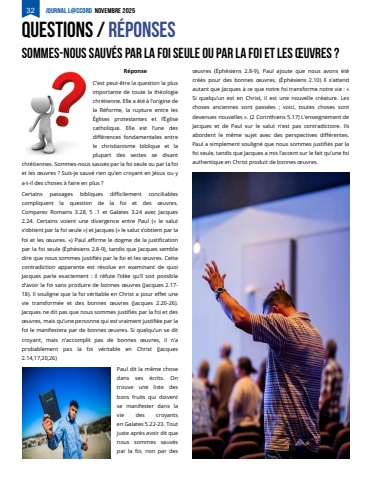32 Journal L@ccord Novembre 2025questions / r%u00e9ponsesSommes-nous sauv%u00e9s par la foi seule ou par la foi et les %u0153uvres ?R%u00e9ponseC%u2019est peut-%u00eatre la question la plus importante de toute la th%u00e9ologie chr%u00e9tienne. Elle a %u00e9t%u00e9 %u00e0 l%u2019origine de la R%u00e9forme, la rupture entre les %u00c9glises protestantes et l%u2019%u00c9glise catholique. Elle est l%u2019une des diff%u00e9rences fondamentales entre le christianisme biblique et la plupart des sectes se disant chr%u00e9tiennes. Sommes-nous sauv%u00e9s par la foi seule ou par la foi et les %u0153uvres ? Suis-je sauv%u00e9 rien qu%u2019en croyant en J%u00e9sus ou y a-t-il des choses %u00e0 faire en plus ?Certains passages bibliques difficilement conciliables compliquent la question de la foi et des %u0153uvres. Comparez Romains 3.28, 5 .1 et Galates 3.24 avec Jacques 2.24. Certains voient une divergence entre Paul (%u00ab le salut s%u2019obtient par la foi seule %u00bb) et Jacques (%u00ab le salut s%u2019obtient par la foi et les %u0153uvres. %u00bb) Paul affirme le dogme de la justification par la foi seule (%u00c9ph%u00e9siens 2.8-9), tandis que Jacques semble dire que nous sommes justifi%u00e9s par la foi et les %u0153uvres. Cette contradiction apparente est r%u00e9solue en examinant de quoi Jacques parle exactement : il r%u00e9fute l%u2019id%u00e9e qu%u2019il soit possible d%u2019avoir la foi sans produire de bonnes %u0153uvres (Jacques 2.17-18). Il souligne que la foi v%u00e9ritable en Christ a pour effet une vie transform%u00e9e et des bonnes %u0153uvres (Jacques 2.20-26). Jacques ne dit pas que nous sommes justifi%u00e9s par la foi et des %u0153uvres, mais qu%u2019une personne qui est vraiment justifi%u00e9e par la foi le manifestera par de bonnes %u0153uvres. Si quelqu%u2019un se dit croyant, mais n%u2019accomplit pas de bonnes %u0153uvres, il n%u2019a probablement pas la foi v%u00e9ritable en Christ (Jacques 2.14,17,20,26)Paul dit la m%u00eame chose dans ses %u00e9crits. On trouve une liste des bons fruits qui doivent se manifester dans la vie des croyants en Galates 5.22-23. Tout juste apr%u00e8s avoir dit que nous sommes sauv%u00e9s par la foi, non par des %u0153uvres (%u00c9ph%u00e9siens 2.8-9), Paul ajoute que nous avons %u00e9t%u00e9 cr%u00e9%u00e9s pour des bonnes %u0153uvres. (%u00c9ph%u00e9siens 2.10) Il s%u2019attend autant que Jacques %u00e0 ce que notre foi transforme notre vie : %u00ab Si quelqu%u2019un est en Christ, il est une nouvelle cr%u00e9ature. Les choses anciennes sont pass%u00e9es ; voici, toutes choses sont devenues nouvelles %u00bb. (2 Corinthiens 5.17) L%u2019enseignement de Jacques et de Paul sur le salut n%u2019est pas contradictoire. Ils abordent le m%u00eame sujet avec des perspectives diff%u00e9rentes. Paul a simplement soulign%u00e9 que nous sommes justifi%u00e9s par la foi seule, tandis que Jacques a mis l%u2019accent sur le fait qu%u2019une foi authentique en Christ produit de bonnes %u0153uvres.