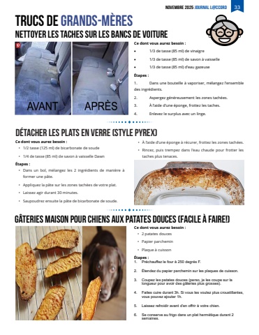 Novembre 2025Journal L@ccord 33Trucs de grands-m%u00e8resNettoyer les taches sur les bancs de voitureD%u00e9tacher les plats en verre (style Pyrex)G%u00e2teries maison pour chiens aux patates douces (Facile %u00e0 faire!)Ce dont vous aurez besoin :%ufffd 1/3 de tasse (85 ml) de vinaigre%ufffd 1/3 de tasse (85 ml) de savon %u00e0 vaisselle %ufffd 1/3 de tasse (85 ml) d%u2019eau gazeuse%u00c9tapes :1. Dans une bouteille %u00e0 vaporiser, m%u00e9langez l%u2019ensemble des ingr%u00e9dients.2. Aspergez g%u00e9n%u00e9reusement les zones tach%u00e9es.3. %u00c0 l%u2019aide d%u2019une %u00e9ponge, frottez les taches.4. Enlevez le surplus avec un linge.Ce dont vous aurez besoin :%u2022 1/2 tasse (125 ml) de bicarbonate de soude%u2022 1/4 de tasse (85 ml) de savon %u00e0 vaisselle Dawn%u00c9tapes :%u2022 Dans un bol, m%u00e9langez les 2 ingr%u00e9dients de mani%u00e8re %u00e0 former une p%u00e2te.%u2022 Appliquez la p%u00e2te sur les zones tach%u00e9es de votre plat.%u2022 Laissez agir durant 30 minutes.%u2022 Saupoudrez ensuite la p%u00e2te de bicarbonate de soude.%u2022 %u00c0 l%u2019aide d%u2019une %u00e9ponge %u00e0 r%u00e9curer, frottez les zones tach%u00e9es.%u2022 Rincez, puis trempez dans l%u2019eau chaude pour frotter les taches plus tenaces. Ce dont vous aurez besoin :%u2022 2 patates douces%u2022 Papier parchemin%u2022 Plaque %u00e0 cuisson%u00c9tapes :1. Pr%u00e9chauffez le four %u00e0 250 degr%u00e9s F.2. %u00c9tendez du papier parchemin sur les plaques de cuisson.3. Coupez les patates douces (perso, je les coupe sur la longueur pour avoir des g%u00e2teries plus grosses).4. Faites cuire durant 3h. Si vous les voulez plus croustillantes, vous pouvez ajouter 1h.5. Laissez refroidir avant d%u2019en offrir %u00e0 votre chien.6. Se conserve au frigo dans un plat herm%u00e9tique durant 2 semaines.