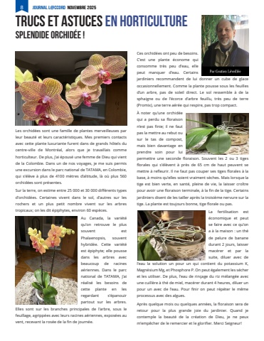 8 Journal L@ccord Novembre 2025Les orchid%u00e9es sont une famille de plantes merveilleuses par leur beaut%u00e9 et leurs caract%u00e9ristiques. Mes premiers contacts avec cette plante luxuriante furent dans de grands h%u00f4tels du centre-ville de Montr%u00e9al, alors que je travaillais comme horticulteur. De plus, j%u2019ai %u00e9pous%u00e9 une femme de Dieu qui vient de la Colombie. Dans un de nos voyages, je me suis permis une excursion dans le parc national de TATAMA, en Colombie, qui s%u2019%u00e9l%u00e8ve %u00e0 plus de 4100 m%u00e8tres d%u2019altitude, l%u00e0 o%u00f9 plus 560 orchid%u00e9es sont pr%u00e9sentes.Sur la terre, on estime entre 25 000 et 30 000 diff%u00e9rents types d%u2019orchid%u00e9es. Certaines vivent dans le sol, d%u2019autres sur les rochers et un plus petit nombre vivent sur les arbres tropicaux; on les dit %u00e9piphytes, environ 60 esp%u00e8ces.Au Canada, la vari%u00e9t%u00e9 qu%u2019on retrouve le plus souvent est Phalaenopsis, souvent hybrid%u00e9e. Cette vari%u00e9t%u00e9 est %u00e9piphyte; elle pousse dans les arbres avec beaucoup de racines a%u00e9riennes. Dans le parc national de TATAMA, j%u2019ai r%u00e9alis%u00e9 les besoins de cette plante en les regardant s%u2019%u00e9panouir partout sur les arbres. Elles sont sur les branches principales de l%u2019arbre, sous le feuillage, agripp%u00e9es avec leurs racines a%u00e9riennes, expos%u00e9es au vent, recevant la ros%u00e9e de la fin de journ%u00e9e.Ces orchid%u00e9es ont peu de besoins. C%u2019est une plante %u00e9conome qui consomme tr%u00e8s peu d%u2019eau, elle peut manquer d%u2019eau. Certains jardiniers recommandent de lui donner un cube de glace occasionnellement. Comme la plante pousse sous les feuilles d%u2019un arbre, pas de soleil direct. Le sol ressemble %u00e0 de la sphaigne ou de l%u2019%u00e9corce d%u2019arbre feuillu, tr%u00e8s peu de terre (Promix), une terre a%u00e9r%u00e9e qui respire, pas trop compact.%u00c0 noter qu%u2019une orchid%u00e9e qui a perdu sa floraison n%u2019est pas finie; il ne faut pas la mettre au rebut ou sur le tas de compost, mais bien davantage en prendre soin pour lui permettre une seconde floraison. Souvent les 2 ou 3 tiges florales qui s%u2019%u00e9l%u00e8vent %u00e0 pr%u00e8s de 65 cm de haut peuvent se mettre %u00e0 refleurir. Il ne faut pas couper ses tiges florales %u00e0 la base, %u00e0 moins qu%u2019elles soient vraiment s%u00e8ches. Mais lorsque la tige est bien verte, en sant%u00e9, pleine de vie, la laisser cro%u00eetre pour avoir une floraison terminale, %u00e0 la fin de la tige. Certains jardiniers disent de les tailler apr%u00e8s la troisi%u00e8me nervure sur la tige. La plante est toujours bonne, tige florale ou pas.La fertilisation est %u00e9conomique et peut se faire avec ce qu%u2019on a %u00e0 la maison : un th%u00e9 de pelure de banane durant 2 jours, laisser mac%u00e9rer et par la suite, diluer avec de l%u2019eau la solution un pour un qui contient du potassium K, Magn%u00e9sium Mg, et Phosphore P. On peut %u00e9galement les s%u00e9cher et les utiliser. De plus, l%u2019eau de rin%u00e7age du riz m%u00e9lang%u00e9e avec une cuill%u00e8re %u00e0 th%u00e9 de miel, mac%u00e9rer durant 4 heures, diluer un pour un avec de l%u2019eau. Pour finir on peut r%u00e9p%u00e9ter le m%u00eame processus avec des algues.Apr%u00e8s quelque mois ou quelques ann%u00e9es, la floraison sera de retour pour la plus grande joie du jardinier. Quand je contemple la beaut%u00e9 de la cr%u00e9ation de Dieu, je ne peux m%u2019emp%u00eacher de le remercier et le glorifier. Merci Seigneur!Trucs et astuces en horticultureSPLENDIDE ORCHID%u00c9E !