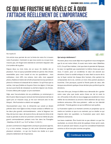 Novembre 2025Journal L@ccord 9ce qui me frustre me r%u00e9v%u00e8le ce %u00e0 quoi j%u2019attache r%u00e9ellement de l%u2019importancePar Audric BCet article nous permet de voir la limite de notre foi %u00e0 travers notre frustration. Comment ce que nous avons ou ce que nous n%u2019avons pas, ont forg%u00e9 notre identit%u00e9 et comment r%u00e9ajuster cela %u00e0 la lumi%u00e8re de la gr%u00e2ce.Depuis deux ou trois mois, j%u2019ai un souci. En r%u00e9alit%u00e9, j%u2019en ai plusieurs. Tout ce que je poss%u00e8de tombe en panne. Des choses essentielles pour mon travail et ma vie quotidienne : mon ordinateur, mon GPS, ma voiture, mon v%u00e9lo, mon appareil photo. J%u2019habite en lisi%u00e8re de la for%u00eat amazonienne et je prends en photo la richesse et la beaut%u00e9 de la cr%u00e9ation. Ce qu%u2019il faut que tu saches, c%u2019est que j%u2019habite en Guyane. Dans ma r%u00e9gion, il n%u2019est pas du tout aussi facile de remplacer ou de faire r%u00e9parer ces choses. %u00c0 moins d%u2019%u00eatre pr%u00eat %u00e0 payer un prix exorbitant.D%u00e9j%u00e0, avec l%u2019accumulation de ces probl%u00e8mes, je commen%u00e7ais %u00e0 %u00eatre frustr%u00e9. Mais lorsqu%u2019en rentrant de l%u2019entrainement de foot et ayant pris un mauvais coup, je me suis retrouv%u00e9 avec le dos bloqu%u00e9... Ma frustration a atteint son apog%u00e9e.Heureusement pour moi, le dimanche qui suivait je devais pr%u00eacher dans mon %u00c9glise et Dieu m%u2019avait conduit %u00e0 r%u00e9fl%u00e9chir sur les deux plus grands commandements : aime le Seigneur ton Dieu de tout ton c%u0153ur, de toute ta force, de toute ton %u00e2me et de toute ta pens%u00e9e et aime ton prochain comme toi-m%u00eame (le plus grand commandement pr%u00e9sent trois fois dans les %u00c9vangiles : Matthieu 22.36-37, Luc 10.27 et Marc 12.30-31.)J%u2019ai alors commenc%u00e9 %u00e0 r%u00e9apprendre une le%u00e7on que j%u2019avais apprise, il y a trois ann%u00e9es, lorsque j%u2019ai %u00e9t%u00e9 priv%u00e9 d%u2019internet pendant plusieurs semaines ; ce qui me frustre me r%u00e9v%u00e8le ce %u00e0 quoi j%u2019attache r%u00e9ellement de l%u2019importance.Qui suis-je r%u00e9ellement ?Pourtant, J%u00e9sus nous avait d%u00e9j%u00e0 mis en garde en nous enseignant que l%u00e0 o%u00f9 est notre tr%u00e9sor, l%u00e0 aussi sera notre c%u0153ur (Matthieu 6.21). Ce qu%u2019il faut r%u00e9aliser, c%u2019est que dans la pens%u00e9e de l%u2019%u00e9poque, le c%u0153ur ne signifiait pas exactement la m%u00eame chose que pour nous. %u00c0 savoir, pour un occidental, le c%u0153ur est associ%u00e9 aux %u00e9motions. Dans la soci%u00e9t%u00e9 antique, le c%u0153ur %u00e9tait la source de la vie, le foyer central de chaque %u00eatre humain, d%u2019o%u00f9 partent les composantes de la vie, comme un tronc d%u2019o%u00f9 partent plusieurs branches. C%u2019est pourquoi, quand la Parole parle du c%u0153ur, elle %u00e9voque assur%u00e9ment quelque chose de bien plus profond que les %u00e9motions. Cela veut dire que, lorsque la Bible nous demande de %u00ab garder notre c%u0153ur plus que toute autre chose car de lui vient la vie %u00bb (Proverbe 4.23), elle ne nous engage pas seulement %u00e0 nous m%u00e9fier de nos %u00e9motions ou encore %u00e0 faire attention de qui nous tombons amoureux. Elle nous pr%u00e9vient : veille sur ton identit%u00e9 profonde ! Prends garde %u00e0 ce qui te d%u00e9finit en tant qu%u2019%u00eatre.La frustration op%u00e8re %u00e0 ce moment comme un projecteur qui va mettre en lumi%u00e8re ce que tu es vraiment, qui va r%u00e9v%u00e9ler ce qui importe dans ton quotidien. La frustration peut venir dans diff%u00e9rents domaines.Les biens mat%u00e9riels. %u00catre frustr%u00e9 de ne pas obtenir ce que l%u2019on souhaitait, ou encore %u00eatre priv%u00e9 de quelque chose qu%u2019on avait, dont on pensait avoir besoin, et que l%u2019on consid%u00e9rait finalement comme un d%u00fb et non plus comme une gr%u00e2ce.