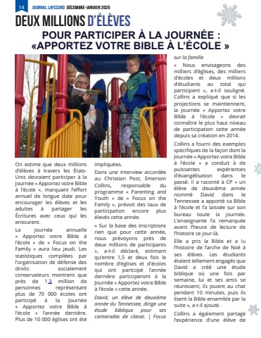 14 Journal L@ccord D%u00c9CEMBRE-JANVIER 2025On estime que deux millions d%u2019%u00e9l%u00e8ves %u00e0 travers les %u00c9tatsUnis devraient participer %u00e0 la Journ%u00e9e %u00ab Apportez votre Bible %u00e0 l%u2019%u00e9cole %u00bb, marquant l%u2019effort annuel de longue date pour encourager les %u00e9l%u00e8ves et les adultes %u00e0 partager les %u00c9critures avec ceux qui les entourent.La journ%u00e9e annuelle %u00ab Apportez votre Bible %u00e0 l%u2019%u00e9cole %u00bb de %u00ab Focus on the Family %u00bb aura lieu jeudi. Les statistiques compil%u00e9es par l%u2019organisation de d%u00e9fense des droits socialement conservateurs montrent que pr%u00e8s de 1,3 million de personnes repr%u00e9sentant plus de 70 000 %u00e9coles ont particip%u00e9 %u00e0 la Journ%u00e9e %u00ab Apportez votre Bible %u00e0 l%u2019%u00e9cole %u00bb l%u2019ann%u00e9e derni%u00e8re. Plus de 10 000 %u00e9glises ont %u00e9t%u00e9 impliqu%u00e9es.Dans une interview accord%u00e9e au Christian Post, Emerson Collins, responsable du programme %u00ab Parenting and Youth %u00bb de %u00ab Focus on the Family %u00bb, pr%u00e9voit des taux de participation encore plus %u00e9lev%u00e9s cette ann%u00e9e.%u00ab Sur la base des inscriptions rien que pour cette ann%u00e9e, nous pr%u00e9voyons pr%u00e8s de deux millions de participants %u00bb, a-t-il d%u00e9clar%u00e9, estimant qu%u2019entre 1,5 et deux fois le nombre d%u2019%u00e9glises et d%u2019%u00e9coles qui ont particip%u00e9 l%u2019ann%u00e9e derni%u00e8re participeront %u00e0 la Journ%u00e9e %u00ab Apportez votre Bible %u00e0 l%u2019%u00e9cole %u00bb cette ann%u00e9e.David, un %u00e9l%u00e8ve de deuxi%u00e8me ann%u00e9e du Tennessee, dirige une %u00e9tude biblique pour ses camarades de classe. | Focus sur la famille%u00ab Nous envisageons des milliers d%u2019%u00e9glises, des milliers d%u2019%u00e9coles et deux millions d%u2019%u00e9tudiants au total qui participent %u00bb, a-t-il soulign%u00e9. Collins a expliqu%u00e9 que si les projections se maintiennent, la Journ%u00e9e %u00ab Apportez votre Bible %u00e0 l%u2019%u00e9cole %u00bb devrait conna%u00eetre le plus haut niveau de participation cette ann%u00e9e depuis sa cr%u00e9ation en 2014.Collins a fourni des exemples sp%u00e9cifiques de la fa%u00e7on dont la Journ%u00e9e %u00ab Apportez votre Bible %u00e0 l%u2019%u00e9cole %u00bb a conduit %u00e0 de puissantes exp%u00e9riences d%u2019%u00e9vang%u00e9lisation dans le pass%u00e9. Il a racont%u00e9 %u00e0 CP %u00ab un %u00e9l%u00e8ve de deuxi%u00e8me ann%u00e9e nomm%u00e9 David dans le Tennessee a apport%u00e9 sa Bible %u00e0 l%u2019%u00e9cole et l%u2019a laiss%u00e9e sur son bureau toute la journ%u00e9e. L%u2019enseignante l%u2019a remarqu%u00e9e avant l%u2019heure de lecture de l%u2019histoire ce jour-l%u00e0.Elle a pris la Bible et a lu l%u2019histoire de l%u2019arche de No%u00e9 %u00e0 ses %u00e9l%u00e8ves. Les %u00e9tudiants %u00e9taient tellement engag%u00e9s que David a cr%u00e9%u00e9 une %u00e9tude biblique o%u00f9 une fois par semaine, lui et ses amis se r%u00e9unissent, ils jouent au chat pendant 10 minutes, puis ils lisent la Bible ensemble par la suite %u00bb, a-t-il ajout%u00e9.Collins a %u00e9galement partag%u00e9 l%u2019exp%u00e9rience d%u2019une %u00e9l%u00e8ve de deuX MILLIONS d%u2019%u00e9l%u00e8vesPOUR PARTICIPER %u00c0 LA JOURN%u00c9E : %u00abAPPORTEZ VOTRE BIBLE %u00c0 L%u2019%u00c9COLE %u00bb