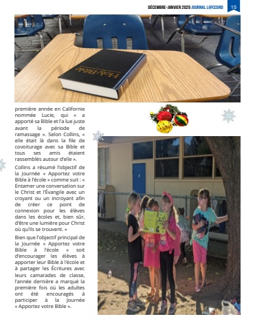 D%u00c9CEMBRE-JANVIER 2025Journal L@ccord 15premi%u00e8re ann%u00e9e en Californie nomm%u00e9e Lucie, qui %u00ab a apport%u00e9 sa Bible et l%u2019a lue juste avant la p%u00e9riode de ramassage %u00bb. Selon Collins, %u00ab elle %u00e9tait l%u00e0 dans la file de covoiturage avec sa Bible et tous ses amis %u00e9taient rassembl%u00e9s autour d%u2019elle %u00bb.Collins a r%u00e9sum%u00e9 l%u2019objectif de la Journ%u00e9e %u00ab Apportez votre Bible %u00e0 l%u2019%u00e9cole %u00bb comme suit : %u00ab Entamer une conversation sur le Christ et l%u2019%u00c9vangile avec un croyant ou un incroyant afin de cr%u00e9er ce point de connexion pour les %u00e9l%u00e8ves dans les %u00e9coles et, bien s%u00fbr, d%u2019%u00eatre une lumi%u00e8re pour Christ o%u00f9 qu%u2019ils se trouvent. %u00bbBien que l%u2019objectif principal de la Journ%u00e9e %u00ab Apportez votre Bible %u00e0 l%u2019%u00e9cole %u00bb soit d%u2019encourager les %u00e9l%u00e8ves %u00e0 apporter leur Bible %u00e0 l%u2019%u00e9cole et %u00e0 partager les %u00c9critures avec leurs camarades de classe, l%u2019ann%u00e9e derni%u00e8re a marqu%u00e9 la premi%u00e8re fois o%u00f9 les adultes ont %u00e9t%u00e9 encourag%u00e9s %u00e0 participer %u00e0 la Journ%u00e9e %u00ab Apportez votre Bible %u00bb.
