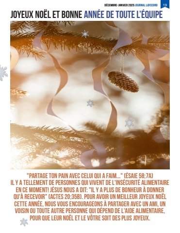 D%u00c9CEMBRE-JANVIER 2025Journal L@ccord 19Joyeux no%u00cbl et bonne ann%u00e9e de toute l%u2019%u00e9quipe\Il y a tellement de personnes qui vivent de l'ins%u00e9curit%u00e9 alimentaire en ce moment! J%u00e9sus nous a dit: \qu'%u00e0 recevoir\cette ann%u00e9e, nous vous encourageons %u00e0 partager avec un ami, un voisin ou toute autre personne qui d%u00e9pend de l'aide alimentaire, pour que leur No%u00ebl et le v%u00f4tre soit des plus joyeux.