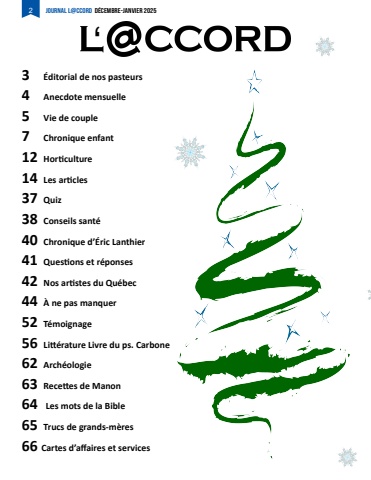 2 Journal L@ccord D%u00c9CEMBRE-JANVIER 20253 %u00c9ditorial de nos pasteurs4 Anecdote mensuelle5 Vie de couple7 Chronique enfant12 Hor%ufffdculture14 Les ar%ufffdcles37 Quiz38 Conseils sant%u00e940 Chronique d%u2019%u00c9ric Lanthier41 Ques%ufffdons et r%u00e9ponses42 Nos ar%ufffdstes du Qu%u00e9bec 44 %u00c0 ne pas manquer52 T%u00e9moignage 56 Li%ufffd%u00e9rature Livre du ps. Carbone62 Arch%u00e9ologie63 Rece%ufffdes de Manon64 Les mots de la Bible65 Trucs de grands-m%u00e8res66 Cartes d%u2019affaires et services%u2018