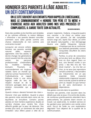 D%u00c9CEMBRE-JANVIER 2025Journal L@ccord 21honorer ses parents %u00e0 l%u2019%u00e2ge adulte :un d%u00e9fi contemporainOn le cite souvent aux enfants pour rappeler l%u2019ob%u00e9issance, mais le commandement %u00ab Honore ton p%u00e8re et ta m%u00e8re %u00bb s%u2019adresse aussi aux adultes! Dans nos vies press%u00e9es et compliqu%u00e9es, il garde toute son actualit%u00e9.Dans des soci%u00e9t%u00e9s o%u00f9 les familles sont %u00e9clat%u00e9es et les rythmes effr%u00e9n%u00e9s, la notion biblique %u00ab d%u2019honorer %u00bb ses parents devient concr%u00e8te: comment vivre cette parole comme une chance relationnelle et non comme une contrainte morale?Lorsqu%u2019on est encore enfant, honorer ses parents semble naturel: ob%u00e9ir, recevoir, apprendre. Une fois adulte, la donne change: les g%u00e9n%u00e9rations vivent souvent loin les unes des autres, les parcours professionnels s%u2019intensifient, les mod%u00e8les familiaux %u00e9voluent. Pourtant, ce commandement est toujours valable. Dans un monde qui valorise surtout l%u2019autonomie et l%u2019individualisme, ce rappel biblique invite %u00e0 une autre logique: celle du lien, du respect mutuel et de la m%u00e9moire partag%u00e9e dans une relation renouvel%u00e9e qui a grandi.Quand %u00ab mieux %u00bb devient l%u2019ennemi de %u00ab bien %u00bbHonorer n%u2019est pas idol%u00e2trer. Quand la place des parents reste centrale dans notre vie, les %u00e9quilibres se brouillent. Certains jeunes adultes en font l%u2019am%u00e8re exp%u00e9rience: %u00e9tudes et carri%u00e8re choisies pour rendre fier, choix affectifs guid%u00e9s par la peur de d%u00e9cevoir. Des ann%u00e9es plus tard, un sentiment de vide peut s%u2019installer: celui d%u2019%u00eatre pass%u00e9 %u00e0 c%u00f4t%u00e9 de sa Par josepha faber boitelpropre trajectoire. Evelyne, cinquante-quatre ans, raconte: %u00ab J%u2019ai choisi un m%u00e9tier pour rassurer mes parents. J%u2019ai %u00e9t%u00e9 comptable durant vingt ans. Apr%u00e8s leur d%u00e9c%u00e8s, j%u2019ai enfin os%u00e9 devenir naturopathe. %u00bb Son t%u00e9moignage illustre une r%u00e9alit%u00e9 fr%u00e9quente: honorer n%u2019implique pas de se conformer aux attentes parentales, surtout lorsqu%u2019elles %u00e9touffent les %u00e9lans personnels.Parfois, la prise de conscience arrive plus tard, au d%u00e9tour d%u2019un mot ou d%u2019un regard. Dans un bus, une femme confie %u00e0 son amie: %u00ab Ma fille m%u2019a dit: %u201cOn dirait mamie%u201d... %u00c7a m%u2019a fait un choc. Je ne veux pas reproduire certains sch%u00e9mas. %u00bb Reconna%u00eetre ces m%u00e9canismes est un pas essentiel. Cette maturit%u00e9 relationnelle s%u2019apprend souvent dans la dur%u00e9e, quand la v%u00e9rit%u00e9 se joint au respect et que l%u2019amour se dit sans domination ni d%u00e9pendance.Des gestes concrets dans le quotidienHonorer ses parents, c%u2019est souvent dans les d%u00e9tails que cela se joue. %u00c0 la sortie des %u00e9coles, de nombreux grands-parents attendent leurs petits-enfants, les parents %u00e9tant encore au travail. Les week-ends, ils rendent service en les gardant pour permettre une soir%u00e9e entre amis. Est-ce de l%u2019aide ou une exploitation d%u00e9guis%u00e9e? Tout d%u00e9pend de la qualit%u00e9 de la communication.
