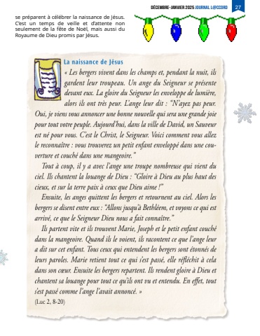 D%u00c9CEMBRE-JANVIER 2025Journal L@ccord 27se pr%u00e9parent %u00e0 c%u00e9l%u00e9brer la naissance de J%u00e9sus. C%u2019est un temps de veille et d%u2019attente non seulement de la f%u00eate de No%u00ebl, mais aussi du Royaume de Dieu promis par J%u00e9sus.