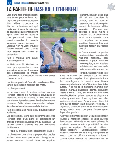 28 Journal L@ccord D%u00c9CEMBRE-JANVIER 2025Lors d%u2019une f%u00eate organis%u00e9e dans une %u00e9cole pour enfants aux capacit%u00e9s particuli%u00e8res, le p%u00e8re d%u2019un %u00e9l%u00e8ve pronon%u00e7a un discours si bouleversant qu%u2019il resta grav%u00e9 dans la m%u00e9moire de tous ceux qui l%u2019entendirent. Apr%u00e8s avoir f%u00e9licit%u00e9 l%u2019%u00e9cole et son personnel pour leur travail admirable, il posa cette question, lourde de sens :%u2014 Lorsque rien ne vient troubler l%u2019ordre naturel des choses, tout atteint une forme de perfection.Puis il marqua une pause avant d%u2019ajouter :%u2014 Mais mon fils, Herbert, ne peut pas apprendre comme les autres enfants. Il ne peut pas comprendre le monde comme eux. O%u00f9 est donc l%u2019ordre naturel des choses en lui ?Un silence profond s%u2019installa dans l%u2019assembl%u00e9e, tandis que chacun m%u00e9ditait ces mots.Le p%u00e8re poursuivit :%u2014 Je crois que lorsqu%u2019un enfant comme Herbert, atteint de handicaps physiques et mentaux, vient au monde, il nous offre une occasion unique d%u2019observer la v%u00e9ritable nature humaine. Cette nature se r%u00e9v%u00e8le dans la fa%u00e7on dont les autres choisissent de le traiter.Puis il raconta une histoire qui bouleversa son auditoire.Un apr%u00e8s-midi, alors qu%u2019il se promenait avec Herbert pr%u00e8s d%u2019un parc, ils crois%u00e8rent un groupe d%u2019enfants qui jouaient au baseball. Le regard brillant d%u2019envie, Herbert demanda timidement:%u2014 Papa, tu crois qu%u2019ils me laisseraient jouer ?Le p%u00e8re savait que, dans la plupart des cas, les enfants n%u2019auraient pas envie d%u2019int%u00e9grer un joueur comme Herbert dans leur %u00e9quipe. Pourtant, il savait aussi que s%u2019ils lui en donnaient la chance, son fils pourrait ressentir, ne serait-ce qu%u2019un instant, le bonheur d%u2019%u00eatre accept%u00e9. Prenant son courage %u00e0 deux mains, il s%u2019approcha d%u2019un des enfants et lui posa la question, sans trop esp%u00e9rer de r%u00e9ponse positive. L%u2019enfant, h%u00e9sitant, balaya le terrain du regard, puis dit :%u2014 On est en train de perdre de six points et on arrive %u00e0 la huiti%u00e8me manche%u2026 Bon, d%u2019accord, il peut rejoindre notre %u00e9quipe, et on essaiera de lui donner sa chance %u00e0 la batte en neuvi%u00e8me manche.Herbert, transport%u00e9 de joie, enfila le maillot de l%u2019%u00e9quipe sous les yeux humides de son p%u00e8re. Il prit place sur le banc des rempla%u00e7ants, le sourire aux l%u00e8vres, rayonnant du simple fait d%u2019%u00eatre l%u00e0, entour%u00e9 des autres. %u00c0 la fin de la huiti%u00e8me manche, son %u00e9quipe marqua quelques points, r%u00e9duisant l%u2019%u00e9cart %u00e0 trois. Puis, en d%u00e9but de neuvi%u00e8me manche, Herbert prit un gant et se pla%u00e7a dans le champ ext%u00e9rieur. Il ne re%u00e7ut aucune balle, mais cela n%u2019avait pas d%u2019importance. Pour lui, %u00eatre sur le terrain %u00e9tait d%u00e9j%u00e0 une victoire. Il rayonnait, un sourire immense illuminant son visage, tandis que son p%u00e8re l%u2019encourageait depuis les gradins.Puis vint le moment d%u00e9cisif. L%u2019%u00e9quipe d%u2019Herbert r%u00e9ussit %u00e0 marquer encore, et voil%u00e0 qu%u2019avec deux joueurs %u00e9limin%u00e9s et les bases pleines, le prochain batteur aurait la possibilit%u00e9 de faire gagner son %u00e9quipe. Ce prochain batteur%u2026 c%u2019%u00e9tait Herbert. Laisseraient-ils Herbert frapper ? Prendraient-ils le risque de perdre ce match pour lui offrir ce moment unique ? Contre toute attente, ils d%u00e9cid%u00e8rent de lui la partie de baseball d%u2019herbert