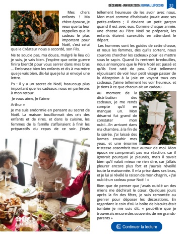 D%u00c9CEMBRE-JANVIER 2025Journal L@ccord 33Mes chers enfants ! Ma ch%u00e8re %u00e9pouse, je veux que tu leur rappelles que le cadeau le plus important pour No%u00ebl, c%u2019est celui que le Cr%u00e9ateur nous a accord%u00e9, son Fils.Ne te soucie pas, ma douce, malgr%u00e9 le lieu o%u00f9 je suis, je vais bien. J%u2019esp%u00e8re que cette guerre finira bient%u00f4t pour vous serrer dans mes bras %u2026 Embrasse bien les enfants et dis %u00e0 ma m%u00e8re que je vais bien, dis-lui que je lui ai envoy%u00e9 une lettre.Ps : il y a un secret de No%u00ebl, beaucoup plus important que les cadeaux, nous en parlerons %u00e0 mon retour.Je vous aime, Je t%u2019aimeArthur %u00bbJe me suis endormie en pensant au secret de No%u00ebl. La maison bouillonnait des cris des enfants et de rires, et dans la cuisine, les femmes de la famille s%u2019affairaient %u00e0 finir les pr%u00e9paratifs du repas de ce soir. J%u2019%u00e9tais tellement heureuse de les avoir avec nous. Mon mari comme d%u2019habitude jouait avec ses petits-enfants ; il devient un petit gar%u00e7on quand il est avec eux. Comme chaque ann%u00e9e, une chasse au P%u00e8re No%u00ebl se pr%u00e9parait, les enfants %u00e9taient surexcit%u00e9s en attendant le d%u00e9part.Les hommes sont les guides de cette chasse, et nous les femmes, d%u00e8s qu%u2019ils sortent, nous courons chercher les cadeaux pour les mettre sous le sapin. Quand ils rentrent bredouilles, nous annon%u00e7ons que le P%u00e8re No%u00ebl est pass%u00e9 et qu%u2019ils l%u2019ont rat%u00e9 de peu. C%u2019est tellement r%u00e9jouissant de voir leur petit visage passer de la d%u00e9ception %u00e0 la joie en voyant tous ces cadeaux. J%u2019aime tellement les voir heureux, et je tiens %u00e0 ce que chacun ait un cadeau.Au moment de la distribution des cadeaux, je me rends compte qu%u2019il en manque un. Mon d%u00e9sarroi fut grand de constater mon oubli%u2026En arrivant dans ma chambre, %u00e0 la fin de la soir%u00e9e, j%u2019ai laiss%u00e9 des larmes envahir mes yeux, et une %u00e9norme tristesse assombrit tout autour de moi. Mon %u00e9poux ne comprenait pas ma r%u00e9action, car il ignorait pourquoi je pleurais, mais il savait bien qu%u2019il valait mieux ne rien dire, car j%u2019allais pleurer encore plus fort et j%u2019aurais r%u00e9veill%u00e9 toute la maisonn%u00e9e. Il m%u2019a prise dans ses bras, et je lui ai r%u00e9v%u00e9l%u00e9 la raison de mon chagrin, %u00ab J%u2019ai oubli%u00e9 un cadeau pour No%u00ebl ! %u00bbRien que de penser que j%u2019avais oubli%u00e9 un des miens me d%u00e9chirait le c%u0153ur. Quelques jours apr%u00e8s la fin des f%u00eates, je suis remont%u00e9e au grenier pour d%u00e9poser les d%u00e9corations. En regardant le coin d%u2019o%u00f9 la bo%u00eete de biscuits %u00e9tait tomb%u00e9e je me suis dit, %u00ab peut-%u00eatre que je trouverais encore des souvenirs de me grandsparents %u00bb