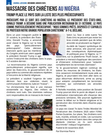 34 Journal L@ccord D%u00c9CEMBRE-JANVIER 2025Pr%u00e9occup%u00e9 par le sort des chr%u00e9tiens au Nig%u00e9ria, le pr%u00e9sident des %u00e9tats-Unis, Donald Trump, a d%u00e9sign%u00e9 dans une publication Instagram du 31 octobre, le pays comme particuli%u00e8rement pr%u00e9occupant. %u201cNous sommes pr%u00eats, dispos%u00e9s et capables de prot%u00e9ger notre grande population chr%u00e9tienne%u201d a-t-il d%u00e9clar%u00e9.Dans un post Instagram publi%u00e9 le 31 octobre, le pr%u00e9sident des %u00c9tatsUnis, Donald Trump, a annonc%u00e9 avoir class%u00e9 le Nigeria sur la liste des pays %u201cparticuli%u00e8rement pr%u00e9occupants%u201d. Cette d%u00e9cision intervient apr%u00e8s que les membres du Congr%u00e8s am%u00e9ricain aient appel%u00e9 le pr%u00e9sident Donald Trump %u00e0 agir contre l%u2019ins%u00e9curit%u00e9 des chr%u00e9tiens dans le pays, le 5 octobre dernier.La reconnaissance du Nigeria comme pays particuli%u00e8rement pr%u00e9occupant signifie, que selon les %u00c9tats-Unis, le gouvernement de ce pays tol%u00e8re ou commet des violations r%u00e9p%u00e9t%u00e9es %u00e0 l'encontre de la libert%u00e9 religieuse.Le pr%u00e9sident a soulev%u00e9 l%u2019urgence de cette d%u00e9cision face aux violences visant la communaut%u00e9 chr%u00e9tienne, tu%u00e9e en %u201cmasse%u201d :%u201cLe christianisme fait face %u00e0 une menace existentielle au Nigeria. Des milliers de chr%u00e9tiens sont tu%u00e9s. Des islamistes radicaux sont responsables de ce massacre de masse.%u201dSelon lui, face %u00e0 cette tuerie %u201cles %u00c9tats-Unis ne peuvent pas rester les bras crois%u00e9s pendant que de telles atrocit%u00e9s se produisent au Nigeria%u201d.Au-del%u00e0 de l%u2019aspect symbolique de cette annonce, elle pourrait avoir des cons%u00e9quences diplomatiques et politiques pour le Nigeria. Le 1ernovembre, sur la plateforme Thuth Social , le pr%u00e9sident a menac%u00e9 d%u2019appliquer des sanctions et d%u2019intervenir militairement pour %u201can%u00e9antir compl%u00e8tement les terroristes islamistes%u201d:%u201cSi le gouvernement nig%u00e9rian continue de tol%u00e9rer les meurtres de chr%u00e9tiens, les %u00c9tatsUnis cesseront imm%u00e9diatement toute aide au Nigeria, et pourraient tr%u00e8s bien aller dans ce pays d%u00e9sormais d%u00e9shonor%u00e9, arme au poing pour an%u00e9antir compl%u00e8tement les terroristes islamistes qui commettent ces atrocit%u00e9s horribles.%u201d%u00c0 l%u2019%u00e9chelle mondiale, cette position de Donald Trump pourrait %u00eatre le point de d%u00e9part %u00e0 une mobilisation internationale afin d%u2019exercer des pressions similaires. Elle pourrait %u00e9galement raviver le d%u00e9bat sur la libert%u00e9 religieuse et la pers%u00e9cution des minorit%u00e9s dans d%u2019autres pays du monde.Le pays est class%u00e9 7e dans l'Index Mondial de Pers%u00e9cution des Chr%u00e9tiens 2025 selon l'ONG Portes Ouvertes. Sur place, \tu%u00e9s, mutil%u00e9s, enlev%u00e9s et viol%u00e9s. Les survivants perdent leur terre et fuient dans des camps de d%u00e9plac%u00e9s internes o%u00f9 ils sont ensuite discrimin%u00e9s\Publi%u00e9 le 03 novembre 2025Par Elormise Pierre Photo Radio-CanadaMassacre des chr%u00e9tiens au nig%u00e9riaTRUMP PLACE LE PAYS SUR LA LISTE DES PLUS PR%u00c9OCCUPANTS
