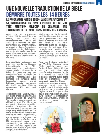 D%u00c9CEMBRE-JANVIER 2025Journal L@ccord 35Une nouvelle traduction de la bible d%u00e9marre toutes les 14 heuresLe programme %u00abVision 2025%u00bb, lanc%u00e9 par Wycliffe et SIL International en 1999, a presque atteint son tr%u00e8s ambitieux objectif de d%u00e9marrer une traduction de la Bible dans toutes les langues Alors que le programme %u00abVision 2025%u00bb arrive %u00e0 son terme, son bilan est impressionnant. Lanc%u00e9 en 1999 par Wycliffe et son partenaire SIL International, ce projet %u2013 plus qu%u2019audacieux %u2013 avait pour objectif de lancer un projet de traduction de la Bible dans toutes les langues qui en avaient besoin d%u2019ici la fin 2025.Les r%u00e9sultats, pr%u00e9sent%u00e9s en mai lors de la conf%u00e9rence internationale de SIL, r%u00e9unissant les principaux acteurs de la traduction de la Bible %u00e0 Johannesburg en Afrique du Sud, montrent un progr%u00e8s remarquable. Le nombre de langues dans lesquelles aucun projet biblique n%u2019existait est pass%u00e9 de 3,000 en l%u2019an 2000 %u00e0 seulement 821 en mai dernier.%u00abL%u2019objectif de la %u00ab Vision 2025 %u00bb est donc presque atteint%u00bb, se r%u00e9jouit l%u2019%u00e9quipe de Wycliffe Suisse dans un communiqu%u00e9 diffus%u00e9 en ao%u00fbt. L%u2019acc%u00e9l%u00e9ration est particuli%u00e8rement notable. %u00abAvant l%u2019adoption de la %u00ab Vision 2025 %u00bb, jamais plus de vingt-cinq traductions de la Bible n%u2019avaient %u00e9t%u00e9 lanc%u00e9es en une seule ann%u00e9e. Aujourd%u2019hui, en moyenne, une traduction d%u00e9bute toutes les 14 heures.%u00bb Dit autrement, sans cette acc%u00e9l%u00e9ration, au rythme des ann%u00e9es 2000 les objectifs de traduction auraient pris 150 ans pour %u00eatre r%u00e9alis%u00e9s.Malgr%u00e9 ces succ%u00e8s, le travail est loin d%u2019%u00eatre termin%u00e9. %u00abPr%u00e8s d%u2019une personne sur cinq dans le monde n%u2019a toujours pas acc%u00e8s %u00e0 la Bible compl%u00e8te dans sa langue%u00bb, souligne la mission. Elle rappelle que derri%u00e8re ces statistiques se trouvent des personnes %u00abqui ont besoin d%u2019%u00eatre touch%u00e9es par la Parole de Dieu%u00bb.Pour Jon ImBeau, pr%u00e9sident de Wycliffe Canada, %u00abune Bible traduite n%u2019est pas l%u2019objectif final. L%u2019objectif final est de voir des vies transform%u00e9es %u00e0 travers l%u2019acc%u00e8s %u00e0 la Parole de Dieu.%u00bb Ces bibles se doivent aussi d%u2019%u00eatre lues et comprises. %u00abC%u2019est pourquoi, Wycliffe Suisse %u2013 tout comme ses partenaires %u2013 s%u2019engage aussi pour les ann%u00e9es %u00e0 venir %u00e0 continuer de renforcer les capacit%u00e9s de l%u2019%u00e9glise locale, %u00e0 proposer des cours d%u2019alphab%u00e9tisation, ainsi qu%u2019%u00e0 former %u00e0 l%u2019interaction avec les %u00c9critures%u00bb, pr%u00e9cise la mission dans son communiqu%u00e9.