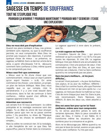 36 Journal L@ccord D%u00c9CEMBRE-JANVIER 2025Sagesse en temps de souffranceTout ne s%u2019explique pasPourquoi %u00e7a m%u2019arrive ? Pourquoi maintenant ? Pourquoi moi ? Seigneur ! J%u2019exige une explication !Dieu ne nous doit pas d%u2019explicationQuand nos plans tombent %u00e0 l%u2019eau, nos pri%u00e8res semblent sans r%u00e9ponse, ou que la souffrance persiste, on veut comprendre. Mais Dieu ne promet pas toujours des r%u00e9ponses. Il promet quelque chose de mieux : sa pr%u00e9sence, sa sagesse, sa fid%u00e9lit%u00e9. Dans ce dernier article de la s%u00e9rie, %u00e0 partir d%u2019Eccl%u00e9siaste 7.8-14, d%u00e9couvre comment faire confiance %u00e0 Dieu m%u00eame quand tu ne comprends pas tout.Mieux vaut finir que commencer%u00ab Mieux vaut la fin d%u2019une chose que son commencement ; mieux vaut un esprit patient qu%u2019un esprit hautain %u00bb (v.8). On aime commencer les choses : une relation, un projet, un plan de lecture biblique. Mais Dieu nous rappelle que ce qui compte, c%u2019est la pers%u00e9v%u00e9rance. Il y a une vraie beaut%u00e9 dans l%u2019endurance, dans le fait de continuer %u00e0 faire confiance%u2026 m%u00eame quand c%u2019est difficile. La sagesse apprend %u00e0 tenir bon.Attention aux raccourcisLes versets 9 et 10 nous avertissent : la col%u00e8re pr%u00e9cipit%u00e9e et la nostalgie excessive sont des pi%u00e8ges. Tu as d%u00e9j%u00e0 eu envie de tout envoyer balader parce que rien ne se passe comme pr%u00e9vu ? Ou peut-%u00eatre, tu r%u00eaves de %u201cl%u2019%u00e9poque d%u2019avant%u201d, o%u00f9 les choses te semblaient plus simples%u2026Mais la col%u00e8re ne construit rien. Et la nostalgie, si elle t%u2019emp%u00eache de voir ce que Dieu fait aujourd%u2019hui, peut te freiner dans ta croissance. La sagesse apprend %u00e0 vivre dans le pr%u00e9sent, avec foi.La vraie sagesse est humble%u00ab Consid%u00e8re l%u2019%u0153uvre de Dieu : qui pourra redresser ce qu%u2019il a courb%u00e9 ? %u00bb (v.13) Tu n%u2019as pas toutes les r%u00e9ponses. Et c%u2019est OK. La sagesse biblique n%u2019est pas d%u2019abord une accumulation de connaissance. C%u2019est une posture de c%u0153ur. C%u2019est reconna%u00eetre que Dieu est Dieu, et que nous sommes ses cr%u00e9atures. C%u2019est lui faire confiance quand tu ne comprends pas ses plans.Dans les jours meilleurs... et les jours difficiles...Le verset 14 est puissant : %u00ab Au jour du bonheur, sois joyeux, et au jour du malheur, r%u00e9fl%u00e9chis : Dieu a fait l%u2019un comme l%u2019autre, afin que l%u2019homme ne d%u00e9couvre en rien ce qui sera apr%u00e8s lui. %u00bb La sagesse, ce n%u2019est pas d%u2019avoir la ma%u00eetrise sur tout. C%u2019est de vivre chaque jour avec foi. Dans la joie, sois reconnaissant. Dans l%u2019%u00e9preuve, sois r%u00e9fl%u00e9chi. Et dans les deux cas, reste attach%u00e9 %u00e0 Dieu.Dieu est assez bon pour qu%u2019on lui fasse confiance, m%u00eame sans tout comprendreTu ne verras peut-%u00eatre jamais le sens de certaines %u00e9preuves. Mais tu peux conna%u00eetre le c%u0153ur de Dieu. Il t%u2019aime. Il est fid%u00e8le. Et il transforme m%u00eame les situations les plus sombres pour ta croissance et sa gloire.Alors ne te d%u00e9courage pas. M%u00eame quand tu ne vois pas le bout du tunnel, avance un pas apr%u00e8s l%u2019autre, avec confiance. Tu n%u2019es pas seul.