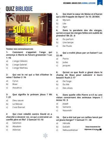 D%u00c9CEMBRE-JANVIER 2025Journal L@ccord 37quiz bibliqueTestez vos connaissances 1- Comment s'appelait l'ange qui annon%u00e7a %u00e0 Marie sa future grossesse ? Luc 1 :16a) L'ange C%u00e9lestinb) L'ange Gabrielc) L'ange Mathieu2- Qui est le roi qui a fait d'Esther la reine ? Esther 2 :16a) Cyrusb) Boazc) Assu%u00e9rus3- Que signifie le pr%u00e9nom J%u00e9sus ? Mt 1 :21 a) Dieu sauveb) Le Messiec) Il est %u00c9ternel4 Qui s%u2019est rebell%u00e9 contre David et a cherch%u00e9 %u00e0 devenir roi, ce qui a entrain%u00e9 un conflit p%u00e8re et fils? 2 Samuel 15 :10a) Salomonb) Absalomc) Adonias 5. Qui %u00e9tait la s%u0153ur de Mo%u00efse et d%u2019Aaron qui a %u00e9t%u00e9 frapp%u00e9e de l%u00e8pre? Ex 15 :20 BDS a) Myriamb) L%u00e9ac) Agar6. Dans la parabole des dix vierges, qu%u2019est-ce que les vierges folles ont oubli%u00e9 de prendre? Mt 25 : 8 a) Du parfumb) Une lampe c) De l%u2019huile 7. Qui a trahit J%u00e9sus par un baiser? Luc 22 :48a) Pierre b) Judas c) Jacques8. Qu%u2019est ce que Ruth a glan%u00e9 dans le champ de Boaz pour subvenir %u00e0 leurs besoin? Ruth 2 :17 a) De l%u2019orgeb) Du bl%u00e9c) Des olives9. Dans quelle ville Pierre a-t-il eu une vision concernant des animaux impurs ? Actes 10 : 5 a) Jopp%u00e9 b) Samarie c) Nazareth 10. Qui a %u00e9t%u00e9 tu%u00e9 par un caillou lanc%u00e9 par un jeune berger? 1 Samuel 11 : 40a) H%u00e9rodeb) Goliathc) Nebucadnetsar Vous trouverez les r%u00e9ponses %u00e0 la page 55