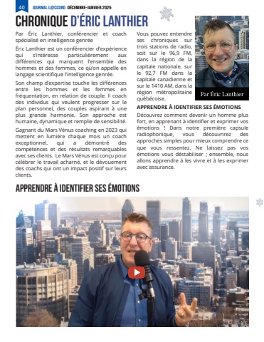 40 Journal L@ccord D%u00c9CEMBRE-JANVIER 2025Chronique d%u2019%u00e9ric lanthierAPPRENDRE %u00c0 IDENTIFIER SES %u00c9MOTIONSPar %u00c9ric Lanthier, conf%u00e9rencier et coach sp%u00e9cialis%u00e9 en intelligence genr%u00e9e%u00c9ric Lanthier est un conf%u00e9rencier d%u2019exp%u00e9rience qui s%u2019int%u00e9resse particuli%u00e8rement aux diff%u00e9rences qui marquent l%u2019ensemble des hommes et des femmes, ce qu%u2019on appelle en langage scientifique l%u2019intelligence genr%u00e9e.Son champ d%u2019expertise touche les diff%u00e9rences entre les hommes et les femmes en fr%u00e9quentation, en relation de couple. Il coach des individus qui veulent progresser sur le plan personnel, des couples aspirant %u00e0 une plus grande harmonie. Son approche est humaine, dynamique et remplie de sensibilit%u00e9. Gagnant du Mars V%u00e9nus coaching en 2023 qui mettent en lumi%u00e8re chaque mois un coach exceptionnel, qui a d%u00e9montr%u00e9 des comp%u00e9tences et des r%u00e9sultats remarquables avec ses clients. Le Mars V%u00e9nus est con%u00e7u pour c%u00e9l%u00e9brer le travail acharn%u00e9, et le d%u00e9vouement des coachs qui ont un impact positif sur leurs clients. Vous pouvez entendre ses chroniques sur trois stations de radio, soit sur le 96,9 FM, dans la r%u00e9gion de la capitale nationale, sur le 92,7 FM dans la capitale canadienne et sur le 1410 AM, dans la r%u00e9gion m%u00e9tropolitaine qu%u00e9b%u00e9coise.APPRENDRE %u00c0 IDENTIFIER SES %u00c9MOTIONSD%u00e9couvrez comment devenir un homme plus fort, en apprenant %u00e0 identifier et exprimer vos %u00e9motions ! Dans notre premi%u00e8re capsule radiophonique, vous d%u00e9couvrirez des approches simples pour mieux comprendre ce que vous ressentez. Ne laissez pas vos %u00e9motions vous d%u00e9stabiliser ; ensemble, nous allons apprendre %u00e0 les vivre et %u00e0 les exprimer avec assurance.