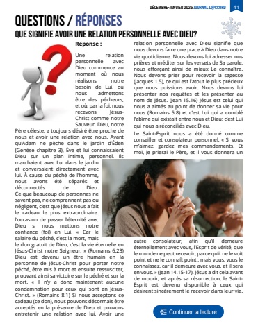 D%u00c9CEMBRE-JANVIER 2025Journal L@ccord 41questions / r%u00e9ponsesQue signifie avoir une relation personnelle avec Dieu? R%u00e9ponse :Une relation personnelle avec Dieu commence au moment o%u00f9 nous r%u00e9alisons notre besoin de Lui, o%u00f9 nous admettons %u00eatre des p%u00e9cheurs, et o%u00f9, par la foi, nous recevons J%u00e9susChrist comme notre Sauveur. Dieu, notre P%u00e8re c%u00e9leste, a toujours d%u00e9sir%u00e9 %u00eatre proche de nous et avoir une relation avec nous. Avant qu%u2019Adam ne p%u00e8che dans le jardin d%u2019%u00c9den (Gen%u00e8se chapitre 3), %u00c8ve et lui connaissaient Dieu sur un plan intime, personnel. Ils marchaient avec Lui dans le jardin et conversaient directement avec lui. %u00c0 cause du p%u00e9ch%u00e9 de l%u2019homme, nous avons %u00e9t%u00e9 s%u00e9par%u00e9s et d%u00e9connect%u00e9s de Dieu.Ce que beaucoup de personnes ne savent pas, ne comprennent pas ou n%u00e9gligent, c%u2019est que J%u00e9sus nous a fait le cadeau le plus extraordinaire: l%u2019occasion de passer l%u2019%u00e9ternit%u00e9 avec Dieu si nous mettons notre confiance (foi) en Lui. %u00ab Car le salaire du p%u00e9ch%u00e9, c%u2019est la mort, mais le don gratuit de Dieu, c%u2019est la vie %u00e9ternelle en J%u00e9sus-Christ notre Seigneur. %u00bb (Romains 6.23) Dieu est devenu un %u00eatre humain en la personne de J%u00e9sus-Christ pour porter notre p%u00e9ch%u00e9, %u00eatre mis %u00e0 mort et ensuite ressusciter, prouvant ainsi sa victoire sur le p%u00e9ch%u00e9 et sur la mort. %u00ab Il n%u2019y a donc maintenant aucune condamnation pour ceux qui sont en J%u00e9susChrist. %u00bb (Romains 8.1) Si nous acceptons ce cadeau (ce don), nous pouvons d%u00e9sormais %u00eatre accept%u00e9s en la pr%u00e9sence de Dieu et pouvons entretenir une relation avec lui. Avoir une relation personnelle avec Dieu signifie que nous devons faire une place %u00e0 Dieu dans notre vie quotidienne. Nous devons lui adresser nos pri%u00e8res et m%u00e9diter sur les versets de Sa parole, nous effor%u00e7ant ainsi de mieux Le conna%u00eetre. Nous devons prier pour recevoir la sagesse (Jacques 1.5), ce qui est l%u2019atout le plus pr%u00e9cieux que nous puissions avoir. Nous devons lui pr%u00e9senter nos requ%u00eates et les pr%u00e9senter au nom de J%u00e9sus. (Jean 15.16) J%u00e9sus est celui qui nous a aim%u00e9s au point de donner sa vie pour nous (Romains 5.8) et c%u2019est Lui qui a combl%u00e9 l%u2019ab%u00eeme qui existait entre nous et Dieu; c%u2019est Lui qui nous a r%u00e9concili%u00e9s avec Dieu.Le Saint-Esprit nous a %u00e9t%u00e9 donn%u00e9 comme conseiller et consolateur personnel. %u00ab Si vous m%u2019aimez, gardez mes commandements. Et moi, je prierai le P%u00e8re, et il vous donnera un autre consolateur, afin qu%u2019il demeure %u00e9ternellement avec vous, l%u2019Esprit de v%u00e9rit%u00e9, que le monde ne peut recevoir, parce qu%u2019il ne le voit point et ne le conna%u00eet point ; mais vous, vous le connaissez, car il demeure avec vous, et il sera en vous. %u00bb (Jean 14.15-17). J%u00e9sus a dit cela avant de mourir, et apr%u00e8s sa r%u00e9surrection, le SaintEsprit est devenu disponible %u00e0 ceux qui d%u00e9sirent sinc%u00e8rement le recevoir dans leur vie.