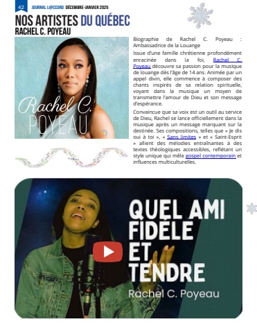 42 Journal L@ccord D%u00c9CEMBRE-JANVIER 2025Biographie de Rachel C. Poyeau : Ambassadrice de la LouangeIssue d%u2019une famille chr%u00e9tienne profond%u00e9ment enracin%u00e9e dans la foi, Rachel C. Poyeau d%u00e9couvre sa passion pour la musique de louange d%u00e8s l%u2019%u00e2ge de 14 ans. Anim%u00e9e par un appel divin, elle commence %u00e0 composer des chants inspir%u00e9s de sa relation spirituelle, voyant dans la musique un moyen de transmettre l%u2019amour de Dieu et son message d%u2019esp%u00e9rance.Convaincue que sa voix est un outil au service de Dieu, Rachel se lance officiellement dans la musique apr%u00e8s un message marquant sur la destin%u00e9e. Ses compositions, telles que %u00ab Je dis oui %u00e0 toi %u00bb, %u00ab Sans limites %u00bb et %u00ab Saint-Esprit %u00bb allient des m%u00e9lodies entra%u00eenantes %u00e0 des textes th%u00e9ologiques accessibles, refl%u00e9tant un style unique qui m%u00eale gospel contemporain et influences multiculturelles.Nos artistes du qu%u00e9becRachel C. Poyeau
