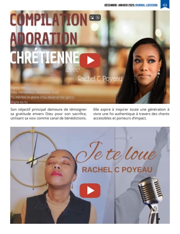 D%u00c9CEMBRE-JANVIER 2025Journal L@ccord 43Son objectif principal demeure de t%u00e9moigner sa gratitude envers Dieu pour son sacrifice, utilisant sa voix comme canal de b%u00e9n%u00e9dictions. Elle aspire %u00e0 inspirer toute une g%u00e9n%u00e9ration %u00e0 vivre une foi authentique %u00e0 travers des chants accessibles et porteurs d%u2019impact.