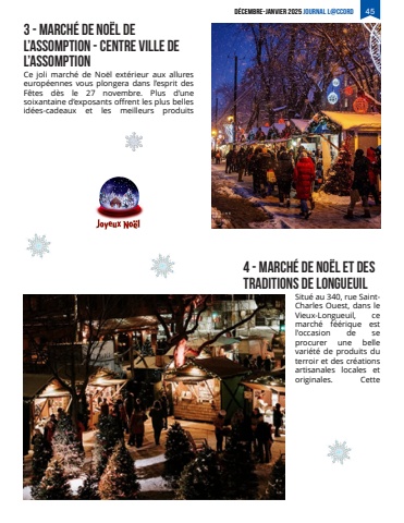 D%u00c9CEMBRE-JANVIER 2025Journal L@ccord 454 - march%u00e9 de no%u00cbl et des traditions de longueuil3 - March%u00e9 de no%u00cbl de l%u2019assomption - centre ville de l%u2019assomptionSitu%u00e9 au 340, rue SaintCharles Ouest, dans le Vieux-Longueuil, ce march%u00e9 f%u00e9%u00e9rique est l'occasion de se procurer une belle vari%u00e9t%u00e9 de produits du terroir et des cr%u00e9ations artisanales locales et originales. Cette Ce joli march%u00e9 de No%u00ebl ext%u00e9rieur aux allures europ%u00e9ennes vous plongera dans l%u2019esprit des F%u00eates d%u00e8s le 27 novembre. Plus d%u2019une soixantaine d%u2019exposants offrent les plus belles id%u00e9es-cadeaux et les meilleurs produits