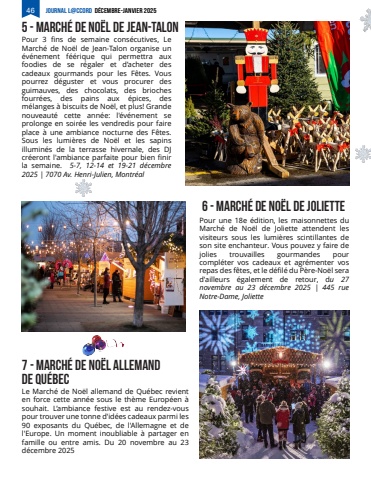 46 Journal L@ccord D%u00c9CEMBRE-JANVIER 20255 - march%u00e9 de No%u00ebl de jean-talon7 - march%u00e9 de No%u00ebl allemand de qu%u00e9bec6 - march%u00e9 de No%u00ebl de joliettePour 3 fins de semaine cons%u00e9cutives, Le March%u00e9 de No%u00ebl de Jean-Talon organise un %u00e9v%u00e9nement f%u00e9%u00e9rique qui permettra aux foodies de se r%u00e9galer et d%u2019acheter des cadeaux gourmands pour les F%u00eates. Vous pourrez d%u00e9guster et vous procurer des guimauves, des chocolats, des brioches fourr%u00e9es, des pains aux %u00e9pices, des m%u00e9langes %u00e0 biscuits de No%u00ebl, et plus! Grande nouveaut%u00e9 cette ann%u00e9e: l'%u00e9v%u00e9nement se prolonge en soir%u00e9e les vendredis pour faire place %u00e0 une ambiance nocturne des F%u00eates. Sous les lumi%u00e8res de No%u00ebl et les sapins illumin%u00e9s de la terrasse hivernale, des DJ cr%u00e9eront l'ambiance parfaite pour bien finir la semaine. 5-7, 12-14 et 19-21 d%u00e9cembre 2025 | 7070 Av. Henri-Julien, Montr%u00e9alPour une 18e %u00e9dition, les maisonnettes du March%u00e9 de No%u00ebl de Joliette attendent les visiteurs sous les lumi%u00e8res scintillantes de son site enchanteur. Vous pouvez y faire de jolies trouvailles gourmandes pour compl%u00e9ter vos cadeaux et agr%u00e9menter vos repas des f%u00eates, et le d%u00e9fil%u00e9 du P%u00e8re-No%u00ebl sera d'ailleurs %u00e9galement de retour, du 27 novembre au 23 d%u00e9cembre 2025 | 445 rue Notre-Dame, JolietteLe March%u00e9 de No%u00ebl allemand de Qu%u00e9bec revient en force cette ann%u00e9e sous le th%u00e8me Europ%u00e9en %u00e0 souhait. L%u2019ambiance festive est au rendez-vous pour trouver une tonne d'id%u00e9es cadeaux parmi les 90 exposants du Qu%u00e9bec, de l'Allemagne et de l'Europe. Un moment inoubliable %u00e0 partager en famille ou entre amis. Du 20 novembre au 23 d%u00e9cembre 2025
