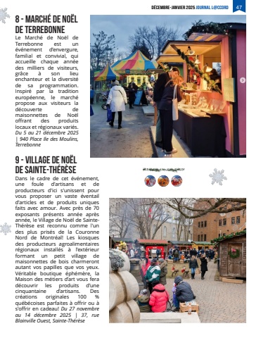 D%u00c9CEMBRE-JANVIER 2025Journal L@ccord 478 - march%u00e9 de No%u00eblde terrebonneLe March%u00e9 de No%u00ebl de Terrebonne est un %u00e9v%u00e9nement d%u2019envergure, familial et convivial, qui accueille chaque ann%u00e9e des milliers de visiteurs, gr%u00e2ce %u00e0 son lieu enchanteur et la diversit%u00e9 de sa programmation. Inspir%u00e9 par la tradition europ%u00e9enne, le march%u00e9 propose aux visiteurs la d%u00e9couverte de maisonnettes de No%u00ebl offrant des produits locaux et r%u00e9gionaux vari%u00e9s. Du 5 au 21 d%u00e9cembre 2025 | 940 Place Ile des Moulins, Terrebonne9 - village de No%u00eblde sainte-th%u00e9r%u00e8seDans le cadre de cet %u00e9v%u00e9nement, une foule d'artisans et de producteurs d'ici s'unissent pour vous proposer un vaste %u00e9ventail d'articles et de produits uniques faits avec amour. Avec pr%u00e8s de 70 exposants pr%u00e9sents ann%u00e9e apr%u00e8s ann%u00e9e, le Village de No%u00ebl de SainteTh%u00e9r%u00e8se est reconnu comme l'un des plus pris%u00e9s de la Couronne Nord de Montr%u00e9al! Les kiosques des producteurs agroalimentaires r%u00e9gionaux install%u00e9s %u00e0 l%u2019ext%u00e9rieur formant un petit village de maisonnettes de bois charmeront autant vos papilles que vos yeux. V%u00e9ritable boutique %u00e9ph%u00e9m%u00e8re, la Maison des m%u00e9tiers d%u2019art vous fera d%u00e9couvrir les produits d%u2019une cinquantaine d%u2019artisans. Des cr%u00e9ations originales 100 % qu%u00e9b%u00e9coises parfaites %u00e0 offrir ou %u00e0 s'offrir en cadeau! Du 27 novembre au 14 d%u00e9cembre 2025 | 37, rue Blainville Ouest, Sainte-Th%u00e9r%u00e8se