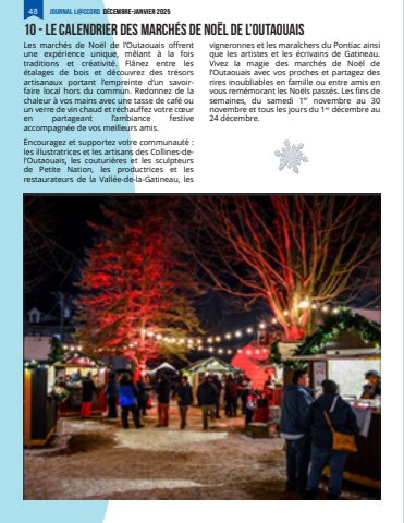 48 Journal L@ccord D%u00c9CEMBRE-JANVIER 202510 - le calendrier des march%u00e9s de No%u00ebl de l%u2019outaouaisLes march%u00e9s de No%u00ebl de l%u2019Outaouais offrent une exp%u00e9rience unique, m%u00ealant %u00e0 la fois traditions et cr%u00e9ativit%u00e9. Fl%u00e2nez entre les %u00e9talages de bois et d%u00e9couvrez des tr%u00e9sors artisanaux portant l%u2019empreinte d%u2019un savoirfaire local hors du commun. Redonnez de la chaleur %u00e0 vos mains avec une tasse de caf%u00e9 ou un verre de vin chaud et r%u00e9chauffez votre c%u0153ur en partageant l%u2019ambiance festive accompagn%u00e9e de vos meilleurs amis.Encouragez et supportez votre communaut%u00e9 : les illustratrices et les artisans des Collines-del%u2019Outaouais, les couturi%u00e8res et les sculpteurs de Petite Nation, les productrices et les restaurateurs de la Vall%u00e9e-de-la-Gatineau, les vigneronnes et les mara%u00eechers du Pontiac ainsi que les artistes et les %u00e9crivains de Gatineau. Vivez la magie des march%u00e9s de No%u00ebl de l%u2019Outaouais avec vos proches et partagez des rires inoubliables en famille ou entre amis en vous rem%u00e9morant les No%u00ebls pass%u00e9s. Les fins de semaines, du samedi 1er novembre au 30 novembre et tous les jours du 1er d%u00e9cembre au 24 d%u00e9cembre.