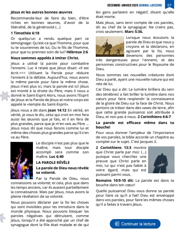 D%u00c9CEMBRE-JANVIER 2025Journal L@ccord 57J%u00e9sus et les autres bonnes %u0153uvresRecommande-leur de faire du bien, d'%u00eatre riches en bonnes %u0153uvres, d'avoir de la lib%u00e9ralit%u00e9, de la g%u00e9n%u00e9rosit%u00e9 (...)1 Timoth%u00e9e 6:18Or quelqu'un a rendu quelque part ce t%u00e9moignage: Qu'est-ce que l'homme, pour que tu te souviennes de lui, Ou le fils de l'homme, pour que tu prennes soin de lui? H%u00e9breux 2:6Nous sommes appel%u00e9s %u00e0 imiter Christ.J%u00e9sus a utilis%u00e9 la parole pour combattre l'ennemi. Luc 4 relate que J%u00e9sus disait: %u00abIl est %u00e9crit.>>> Utilisant la Parole pour r%u00e9duire l'ennemi %u00e0 la d%u00e9faite. Aujourd'hui, nous avons la m%u00eame parole pour faire la m%u00eame chose. J%u00e9sus n'est plus ici, mais la parole est ici! J%u00e9sus est mont%u00e9 %u00e0 la droite du P%u00e8re, mais il nous a donn%u00e9 le Saint-Esprit Alors, nous avons l'Esprit de J%u00e9sus et la Parole de J%u00e9sus et notre corps est appel%u00e9 le %u00abtemple du Saint-Esprit%u00bb.J%u00e9sus nous a dit dans Jean 14:12 En v%u00e9rit%u00e9, en v%u00e9rit%u00e9, je vous le dis, celui qui croit en moi fera aussi les %u0153uvres que je fais, et il en fera de plus grandes, parce que je m'en vais au P%u00e8re ... J%u00e9sus nous dit que nous ferons comme lui et m%u00eame des choses plus grandes parce qu'il s'en va au P%u00e8re.Le disciple n'est pas plus que le ma%u00eetre; mais tout disciple accompli sera comme son ma%u00eetre. Luc 6:40LA PAROLE R%u00c9V%u00c8LELa parole de Dieu nous r%u00e9v%u00e8le sa volont%u00e9.Par la Parole de Dieu, nous connaissons sa volont%u00e9; et cela, plus que dans les temps anciens, car ils avaient partiellement la connaissance. Mais par J%u00e9sus, nous avons la pleine r%u00e9v%u00e9lation de sa volont%u00e9.Nous pouvons d%u00e9clarer par la foi les choses qui sont invisibles pour les introduire dans le monde physique. Nous pouvons bloquer les paroles n%u00e9gatives qui d%u00e9truisent, comme J%u00e9sus, lorsqu'il a %u00e9t%u00e9 approch%u00e9 par un chef de synagogue dont la fille %u00e9tait malade et de qui les gens parlaient en n%u00e9gatif, disant qu'elle %u00e9tait morte.Mais J%u00e9sus, sans tenir compte de ces paroles, dit au chef de la synagogue: Ne crains pas, crois seulement. Marc 5:36.Lorsque nous %u00e9coutons la parole de Dieu et que nous y croyons et la d%u00e9clarons, en agissant par la foi, nous devenons des personnes tr%u00e8s dangereuses pour l'ennemi, et des personnes constructives pour le Royaume de Dieu.Nous sommes ces nouvelles cr%u00e9atures dont Dieu a parl%u00e9, ayant une nouvelle nature qui est n%u00e9e de lui.Car Dieu qui a dit: La lumi%u00e8re brillera du sein des t%u00e9n%u00e8bres! a fait briller la lumi%u00e8re dans nos c%u0153urs pour faire resplendir la connaissance de la gloire de Dieu sur la face de Christ. Nous portons ce tr%u00e9sor dans des vases de terre, afin que cette grande puissance soit attribu%u00e9e %u00e0 Dieu, et non pas %u00e0 nous. 2 Corinthiens 4:6-7La parole est efficace m%u00eame dans ta bouche!Pour vous donner l'ampleur de l'importance de vos paroles, la bible accorde un chapitre au complet sur le sujet. C'est Jacques 3.2 Corinthiens 13:3 montre que Christ parle par moi: (...) puisque vous cherchez une preuve que Christ parle en moi, lui qui n'est pas faible %u00e0 votre %u00e9gard, mais qui est puissant parmi vous.Romains 10:9-10 dit: La parole est dans ta bouche dans ton c%u0153ur!Quelle puissance! Dieu vous donne sa parole pour faire ce qu'il a fait! Dieu est envelopp%u00e9 dans vos paroles, pour faire les m%u00eames choses qu'il a faites %u00e0 travers J%u00e9sus.