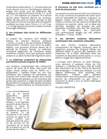 D%u00c9CEMBRE-JANVIER 2025Journal L@ccord 59le deuxi%u00e8me si%u00e8cle apr%u00e8s J.-C. L%u2019universitaire juif Frank Moore Cross et l%u2019arch%u00e9ologue Nahman Avigad ont conclu que les fragments des rouleaux ont %u00e9t%u00e9 %u00e9crits entre 225 av. J.-C. et 50 ap. J.-C. Une datation au carbone 14 a estim%u00e9 qu%u2019une peau d%u2019animal d%u2019entre les rouleaux datait d%u2019%u00e0 peu pr%u00e8s la m%u00eame p%u00e9riode et des monnaies en bronze trouv%u00e9es pr%u00e8s des grottes semblent se situer entre 135 av. J.-C. et 73 ap. J.-C. Il s%u2019agit des plus anciennes copies connues d%u2019ouvrages bibliques.6. Les rouleaux sont %u00e9crits en diff%u00e9rentes langues.La plupart des rouleaux sont r%u00e9dig%u00e9s en h%u00e9breu en utilisant l%u2019%u00e9criture standard %u00ab carr%u00e9e %u00bb (%u00ab juive %u00bb), qui est similaire %u00e0 l%u2019h%u00e9breu d%u2019aujourd%u2019hui. Plusieurs sont %u00e9crits en pal%u00e9oh%u00e9breu, une ancienne %u00e9criture datant de la p%u00e9riode du Premier Temple. La collection comprend %u00e9galement de nombreux textes aram%u00e9ens et grecs, ainsi que quelques textes arabes et un petit nombre de fragments latins.7. La collection comprend de minuscules parchemins port%u00e9s en guise de Tefillin.Les rouleaux comprennent des manuscrits entiers de livres de la Bible, mais aussi des objets rituels utilis%u00e9s avec les Tefillin ou %u00ab phylact%u00e8res %u00bb (petites bo%u00eetes en cuir noir contenant des rouleaux de parchemin sur lesquels sont inscrits des versets de la Torah) et les Mezouzah (plac%u00e9es sur les montants des portes des maisons). Il s%u2019agit de petits feuillets de parchemin contenant des extraits de textes bibliques, conform%u00e9ment au Deut%u00e9ronome 6. 6-9 :%u00ab Les commandements que je te donne aujourd%u2019hui seront dans ton c%u0153ur. Tu les r%u00e9p%u00e9teras %u00e0 tes enfants ; tu en parleras quand tu seras chez toi, quand tu seras en voyage, quand tu te coucheras et quand tu te l%u00e8veras. Tu les attacheras %u00e0 tes mains comme un signe et ils seront comme une marque entre tes yeux. Tu les %u00e9criras sur les montants de la porte de ta maison et sur les portes de tes villes. %u00bb8. Personne ne sait avec certitude qui a %u00e9crit les documents.Les savants ne sont pas arriv%u00e9s %u00e0 un consensus en ce qui concerne la question de savoir qui a cr%u00e9%u00e9 et rassembl%u00e9 les rouleaux originaux. La plupart croient que c%u2019%u00e9tait une secte juive, m%u00eame si certains ont fait valoir qu%u2019il s%u2019agirait de chr%u00e9tiens du premier si%u00e8cle. Sur la base des donn%u00e9es actuelles, les groupes les plus plausibles semblent %u00eatre soit les Ess%u00e9niens, soit les Sadduc%u00e9ens (en particulier une communaut%u00e9 dirig%u00e9e par des pr%u00eatres Zadokites ; 1 Chron. 16:39).9. Les derniers rouleaux d%u00e9couverts contiennent des variations textuelles.Les plus r%u00e9cents rouleaux d%u00e9couverts comprennent de l%u00e9g%u00e8res variations dans la traduction grecque de l%u2019original h%u00e9breu qui diff%u00e8rent d%u2019avec la version des Septante, une traduction de la Bible h%u00e9bra%u00efque faite aux troisi%u00e8me et deuxi%u00e8me si%u00e8cles avant J.-C. et qui %u00e9tait en usage dans l%u2019%u00e9glise primitive.%u00ab Lorsque nous pensons au texte biblique, nous pensons %u00e0 quelque chose de tr%u00e8s statique %u00bb, a d%u00e9clar%u00e9 Joe Uziel, chef de l%u2019unit%u00e9 des manuscrits de la mer Morte de l%u2019Autorit%u00e9 des antiquit%u00e9s. %u00ab Il n%u2019%u00e9tait pas statique. Il y a de l%u00e9g%u00e8res diff%u00e9rences, dont certaines sont importantes. Chaque petit %u00e9l%u00e9ment d%u2019information que nous pouvons ajouter nous permet de comprendre un peu mieux %u00bb comment le texte a pris sa forme h%u00e9bra%u00efque traditionnelle.Par JOE CARTER/TGC