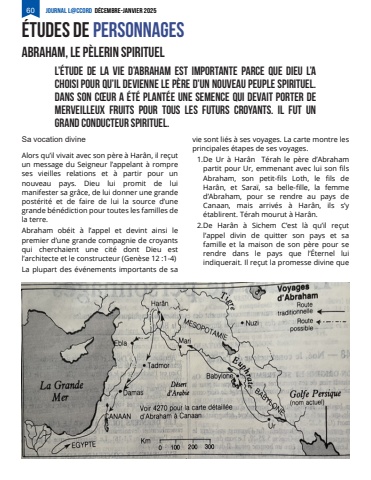 60 Journal L@ccord D%u00c9CEMBRE-JANVIER 2025%u00c9tudes de personnagesAbraham, le p%u00e8lerin spirituelL%u2019%u00e9tude de la vie d%u2019Abraham est importante parce que Dieu l%u2019a choisi pour qu%u2019il devienne le p%u00e8re d%u2019un nouveau peuple spirituel. Dans son c%u0153ur a %u00e9t%u00e9 plant%u00e9e une semence qui devait porter de merveilleux fruits pour tous les futurs croyants. Il fut un grand conducteur spirituel.Sa vocation divineAlors qu%u2019il vivait avec son p%u00e8re %u00e0 Har%u00e2n, il re%u00e7ut un message du Seigneur l%u2019appelant %u00e0 rompre ses vieilles relations et %u00e0 partir pour un nouveau pays. Dieu lui promit de lui manifester sa gr%u00e2ce, de lui donner une grande post%u00e9rit%u00e9 et de faire de lui la source d%u2019une grande b%u00e9n%u00e9diction pour toutes les familles de la terre. Abraham ob%u00e9it %u00e0 l%u2019appel et devint ainsi le premier d%u2019une grande compagnie de croyants qui cherchaient une cit%u00e9 dont Dieu est l%u2019architecte et le constructeur (Gen%u00e8se 12 :1-4) La plupart des %u00e9v%u00e9nements importants de sa vie sont li%u00e9s %u00e0 ses voyages. La carte montre les principales %u00e9tapes de ses voyages. 1. De Ur %u00e0 Har%u00e2n T%u00e9rah le p%u00e8re d%u2019Abraham partit pour Ur, emmenant avec lui son fils Abraham, son petit-fils Loth, le fils de Har%u00e2n, et Sara%u00ef, sa belle-fille, la femme d%u2019Abraham, pour se rendre au pays de Canaan, mais arriv%u00e9s %u00e0 Har%u00e2n, ils s%u2019y %u00e9tablirent. T%u00e9rah mourut %u00e0 Har%u00e2n. 2. De Har%u00e2n %u00e0 Sichem C%u2019est l%u00e0 qu%u2019il re%u00e7ut l%u2019appel divin de quitter son pays et sa famille et la maison de son p%u00e8re pour se rendre dans le pays que l%u2019%u00c9ternel lui indiquerait. Il re%u00e7ut la promesse divine que