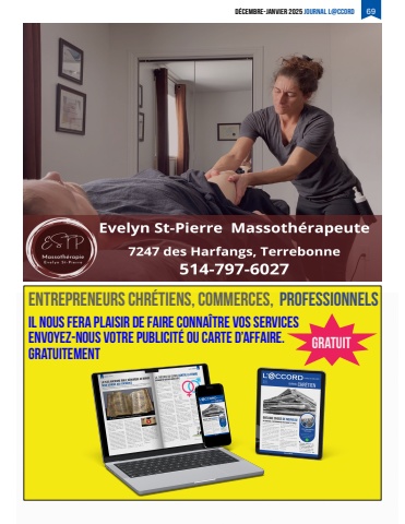 D%u00c9CEMBRE-JANVIER 2025Journal L@ccord 69Entrepreneurs chr%u00e9tiens, commerces, professionnelsIl nous fera plaisir de faire conna%u00eetre vos servicesEnvoyez-nous votre publicit%u00e9 ou carte d%u2019affaire.gratuitement Gratuit