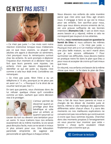 D%u00c9CEMBRE-JANVIER 2025Journal L@ccord 7ce n%u2019est pas juste !%u00ab Ce n%u2019est pas juste ! %u00bb Ces mots sont notre r%u00e9action instinctive lorsque nous n%u2019obtenons pas ce que nous voulons. La plupart des adultes ont appris %u00e0 dissimuler ce sentiment, c%u2019est pourquoi nous le remarquons surtout chez les enfants. Ils sont prompts %u00e0 d%u00e9plorer l%u2019injustice d%u2019un moment et %u00e0 d%u00e9clarer haut et fort que leurs parents sont injustes. Les enfants n%u2019ont pas besoin d%u2019apprendre %u00e0 identifier ce qui est juste ou injuste, c%u2019est comme si cela leur %u00e9tait inn%u00e9. Consid%u00e9rez ces remarques:%u00ab Ce n%u2019est pas juste. Mon fr%u00e8re a eu un t%u00e9l%u00e9phone %u00e0 13 ans, pourquoi je ne peux pas en avoir un ? %u00bb. %u00ab Pourquoi il a le droit de se coucher tard et pas moi ? %u00bbEn tant que parents, vous choisissez donc de lui refuser quelque chose qu%u2019il consid%u00e8re comme un bien, sachant que votre d%u00e9cision vise %u00e0 le prot%u00e9ger.L%u2019amour permet de discerner quand un privil%u00e8ge peut %u00eatre b%u00e9n%u00e9fique et utile pour un enfant, et quand il pourrait lui causer du tort ou devenir une tentation pour un autre. Si nous traitions tous nos enfants exactement de la m%u00eame mani%u00e8re, la vie serait peut-%u00eatre plus facile, mais ce ne serait ni mieux ni plus aimant pour eux. Une %u00e9ducation parentale empreinte de sagesse est personnelle et sp%u00e9cifique %u00e0 chaque enfant.Nous %u00e9levons nos enfants de cette mani%u00e8re parce que c%u2019est ainsi que Dieu agit envers nous. Il s%u2019engage %u00e0 faire ce qui est le mieux pour ses enfants. Son sacrifice pour nous, alors que nous %u00e9tions encore ennemis de lui, est une preuve suffisante de ses bonnes intentions (Romains 5.8). Il sait ce dont nous avons besoin et y r%u00e9pond, m%u00eame si cela ne correspond pas toujours %u00e0 nos attentes.Parfois, nous remettons aussi en question la bont%u00e9 de Dieu et nous utilisons les m%u00eames mots accusateurs : %u00ab Ce n%u2019est pas juste. %u00bb Pourquoi mon ami a-t-il un meilleur emploi ou une plus belle maison, ou est-il mari%u00e9 alors que je suis encore c%u00e9libataire ? Pour surmonter ces difficult%u00e9s, nous devons mettre en pratique notre foi dans le plan que Dieu a pour nous et accepter de croire qu%u2019il sait mieux que nous.En r%u00e9sum%u00e9, nos enfants ont besoin de la m%u00eame chose que nous : la foi dans le plan de Dieu. Dieu a fait de nous leurs parents et nous a charg%u00e9s de les %u00e9lever de mani%u00e8re juste et bonne, m%u00eame si cela implique des approches diff%u00e9rentes selon chacun d%u2019eux. Il y aura des moments o%u00f9 nos meilleures explications ne convaincront pas nos enfants qui continueront %u00e0 croire que nous sommes injustes. Cherchez donc des moments propices %u00e0 l%u2019enseignement o%u00f9 vous pourrez leur montrer que cette %u00ab bonne %u00bb chose qu%u2019ils voulaient n%u2019%u00e9tait finalement pas si bonne que %u00e7a.